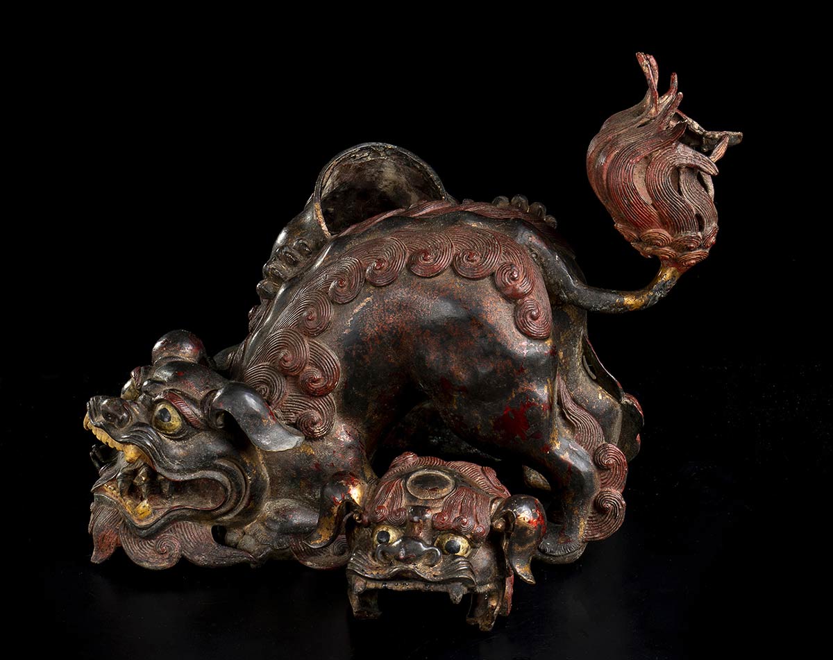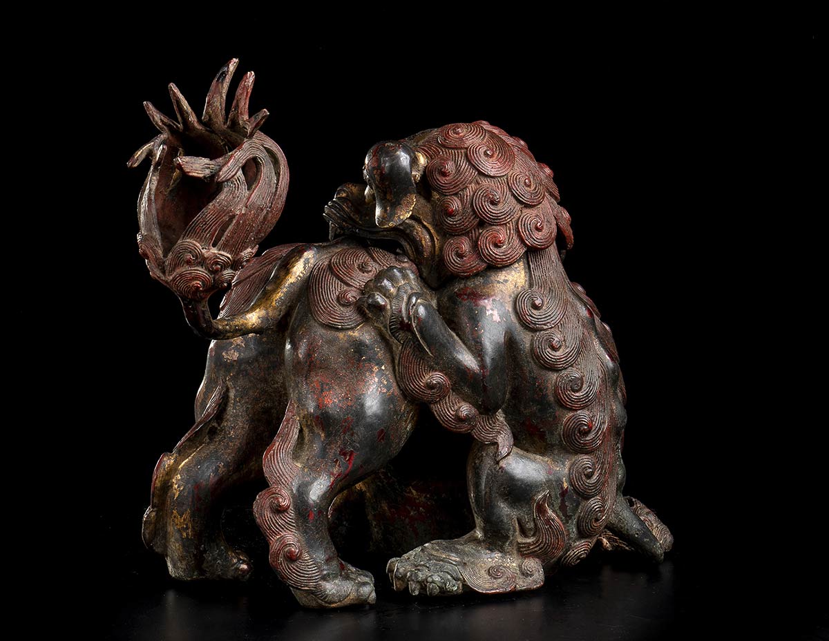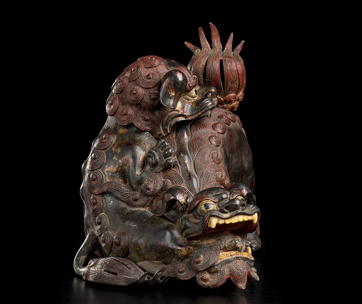 SCULTURA IN BRONZO LACCATO CON DUE LEONI BUDDHISTI<br>Giappone, XIX secolo<br>
