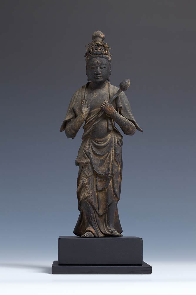 La divinità – scolpita in un unico blocco di cipresso hinoki (tecnica dell'ichiboku zukuri) - raffigurata stante, le gambe in posa dinamica, le braccia piegate al petto, una mano a sorreggere un fiore di loto, l'ampia veste elegantemente drappeggiata, sul capo una corona arricchita di inserti in metallo dorato, il volto dall'espressione decisa e rasserenante, occhi in cristallo.