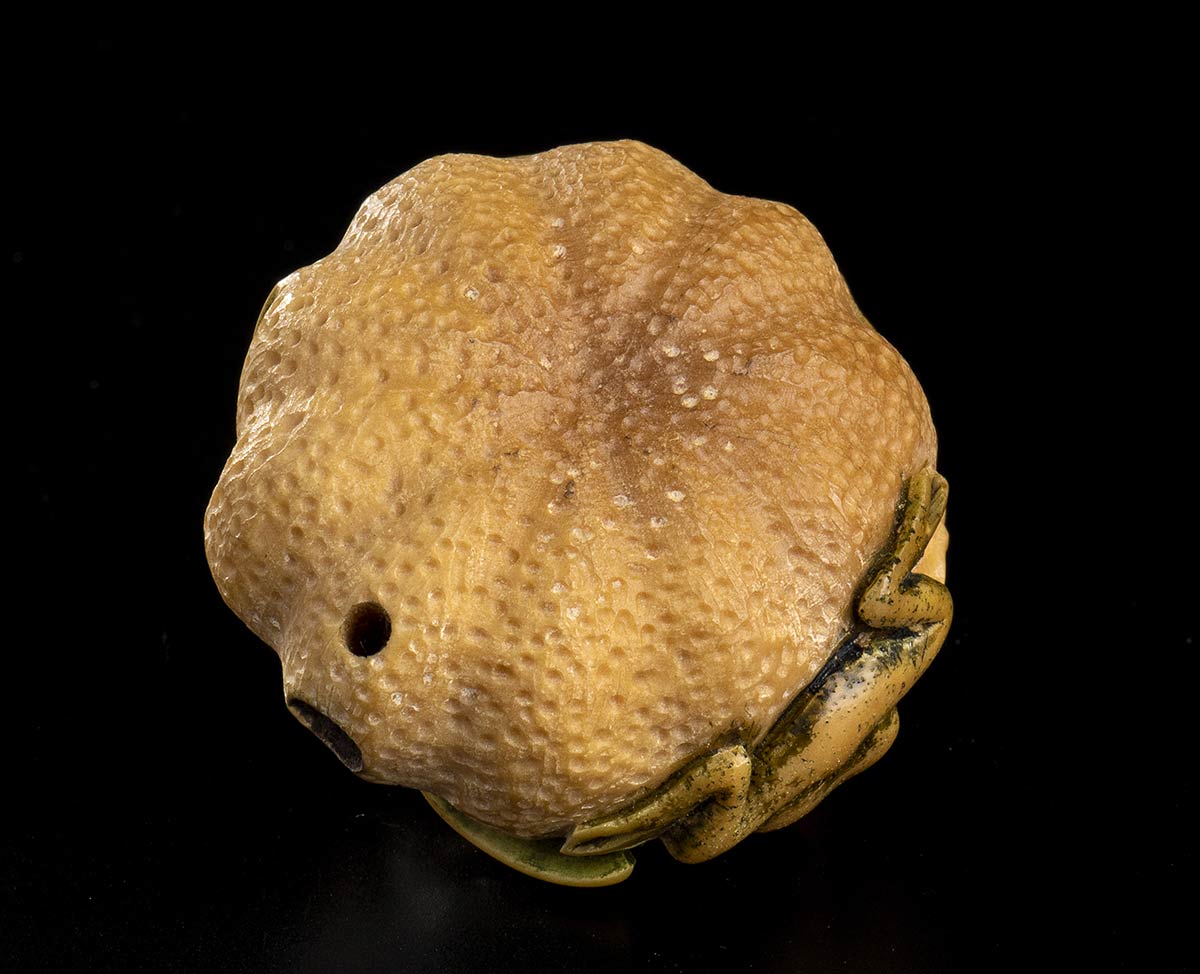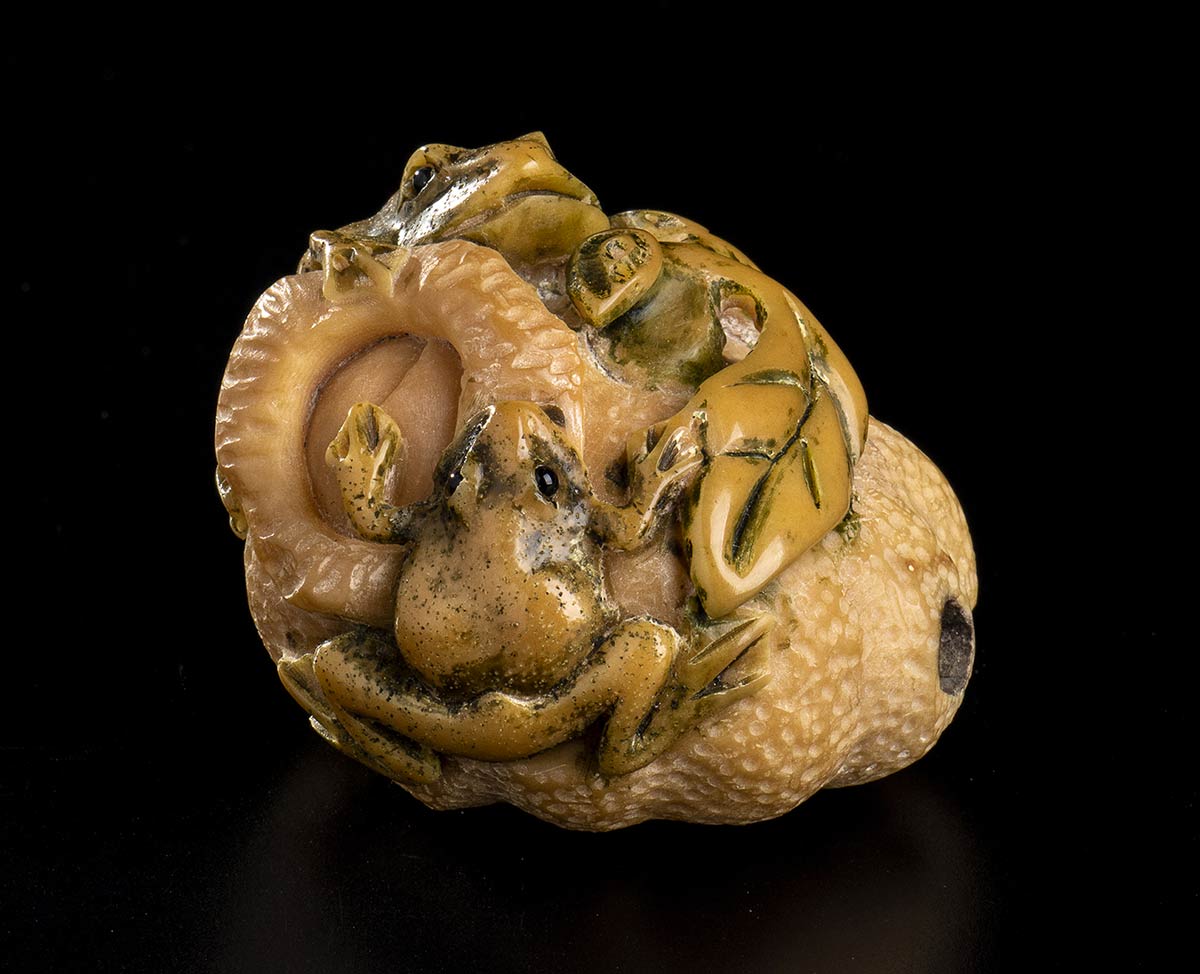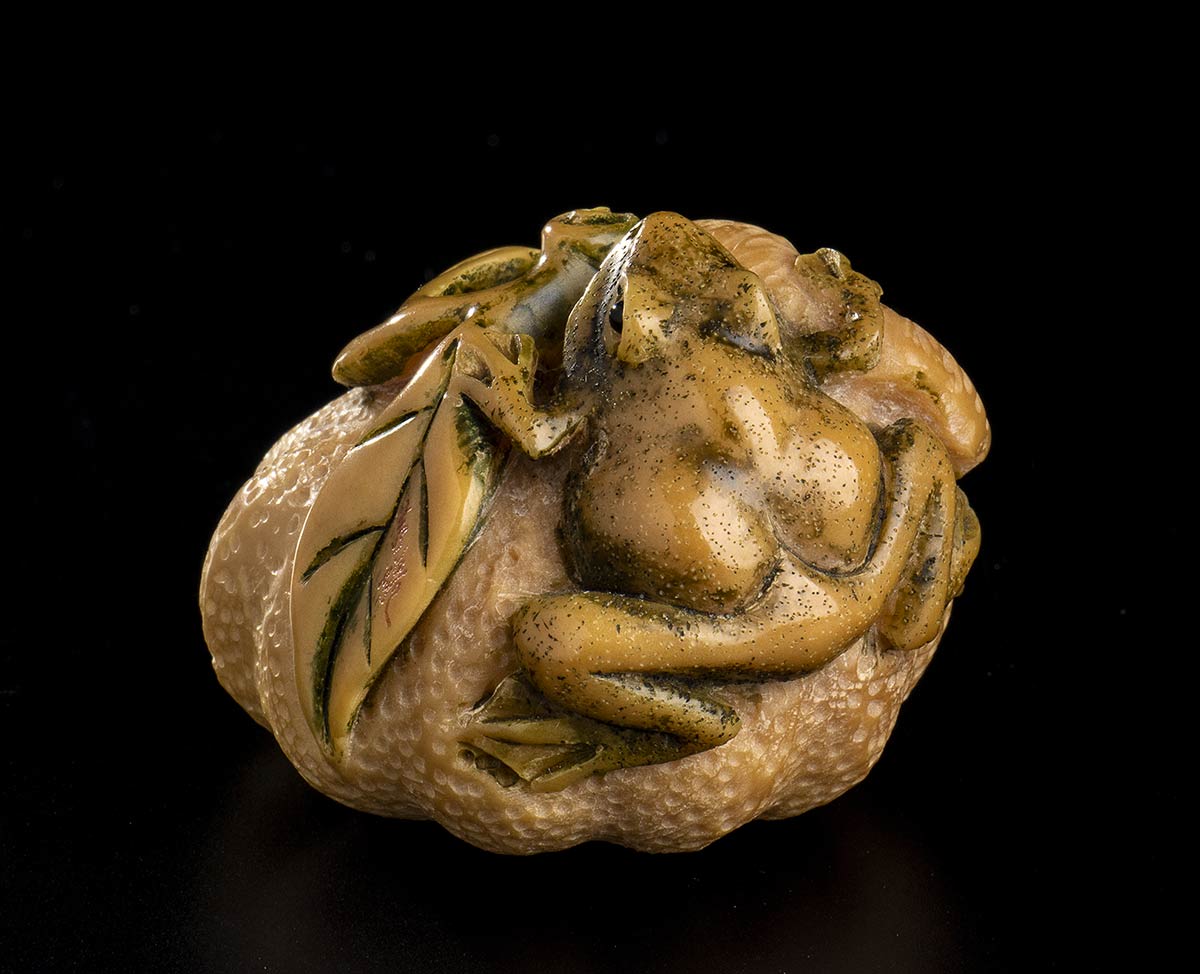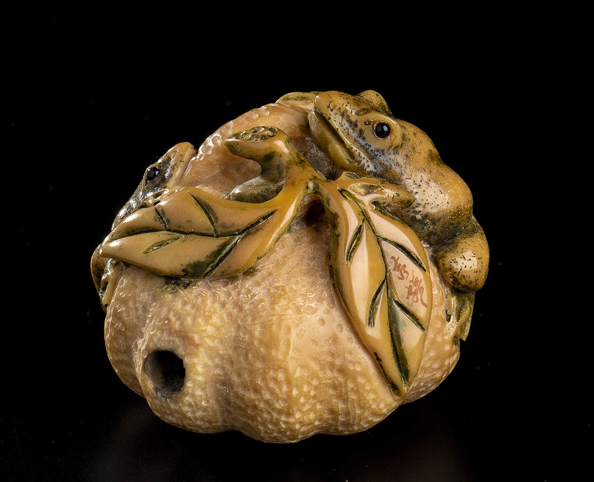 NETSUKE IN AVORIO CON FRUTTO E RANE<br>Giappone, XX secolo<br><br><br>