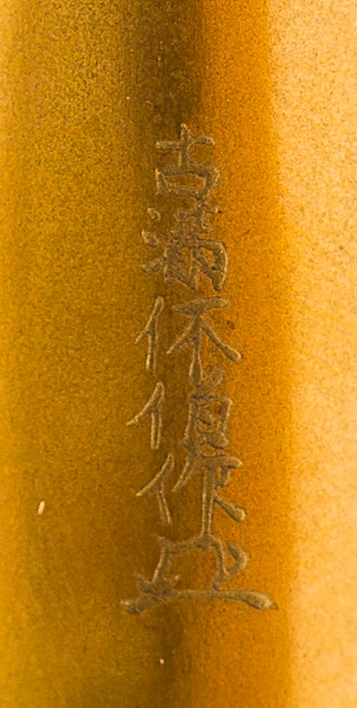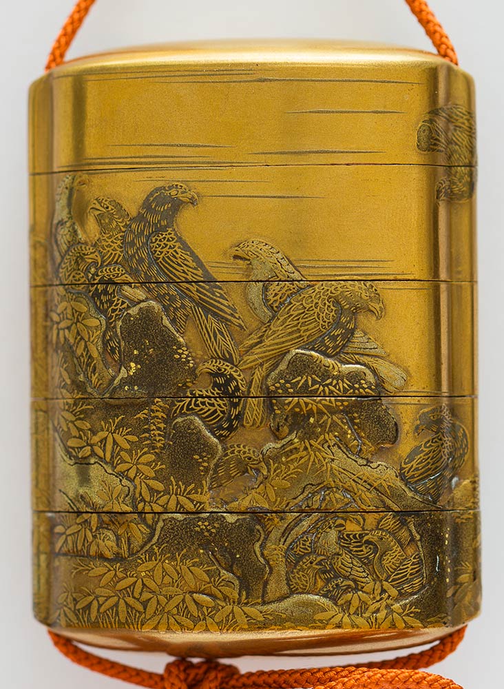 Laccato sull'esterno in haramaki-e e all'interno in nashiji (“buccia di pera”), la decorazione consiste di falchi nel paesaggio, firmato Koma Yasunori saku.