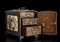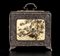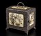 A sezione rettangolare, ha struttura in legno laccato con fondo a 'buccia di pera' (nashiji), rivestito di piastra in argento con ricco decoro floreale a sbalzo, sui lati grandi placche in avorio intarsiate a madreperla con scene di fiori e uccelli, sul davanti uno sportellino rivela cassetti interni, firmato sul lato inferiore 安友 (Yasutomo).