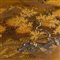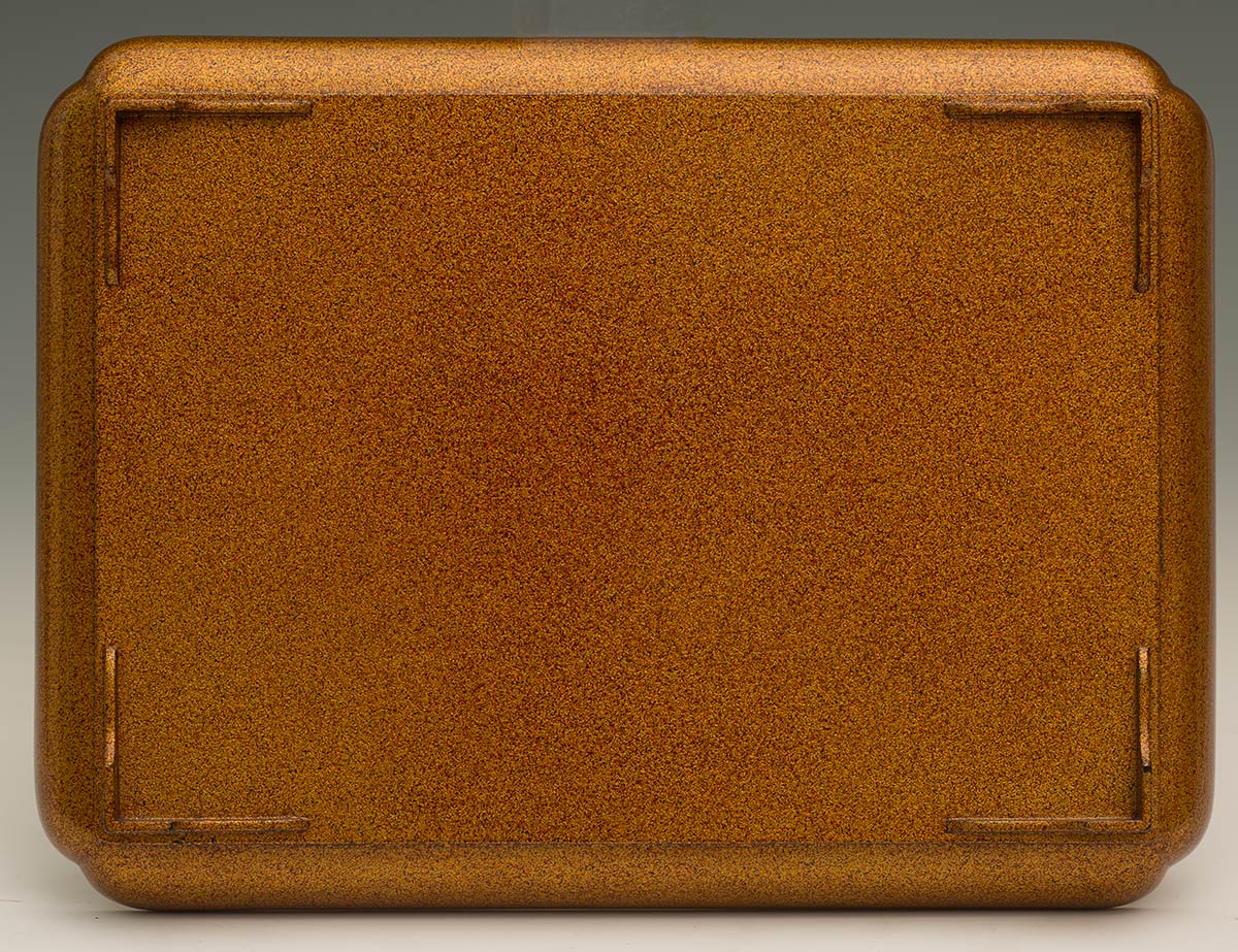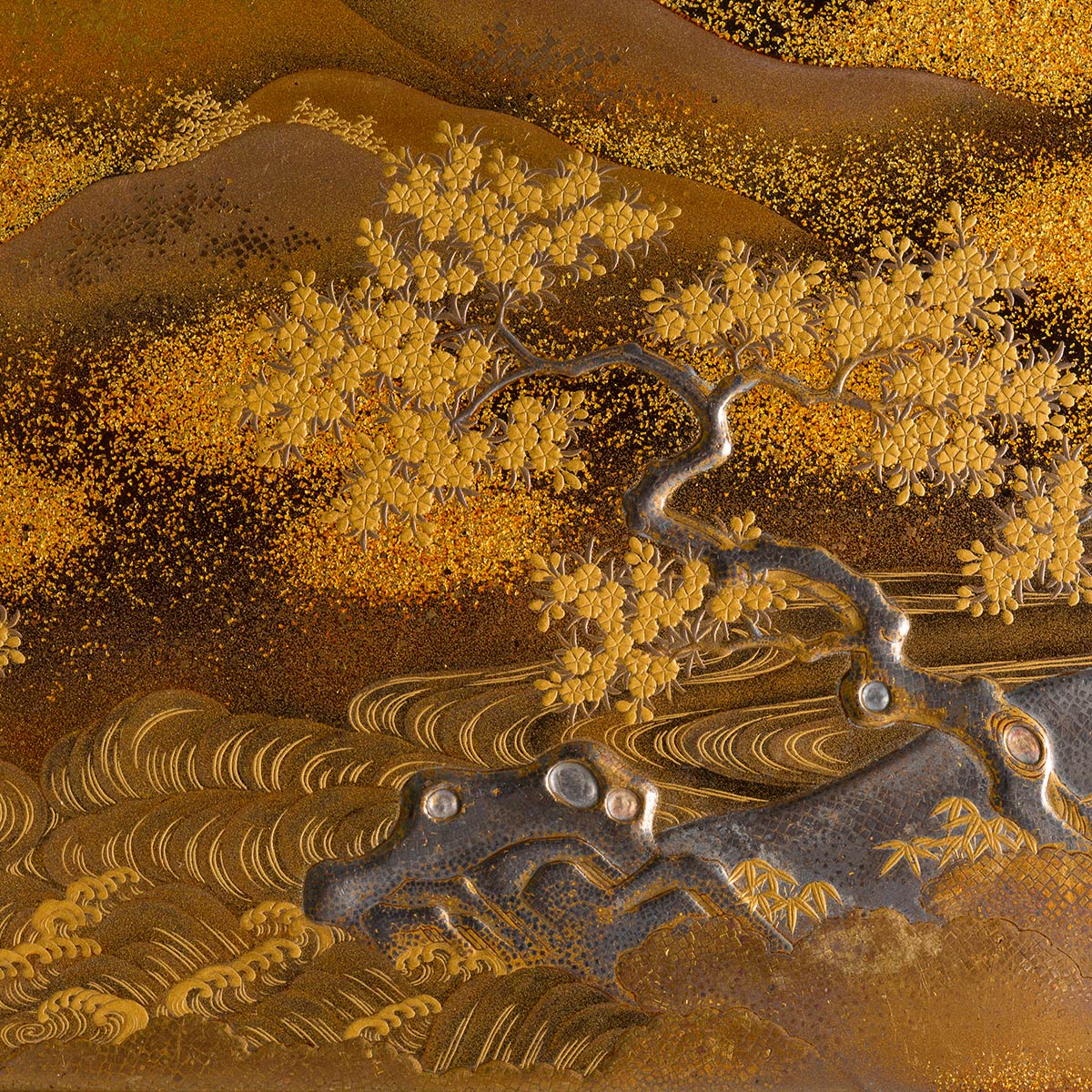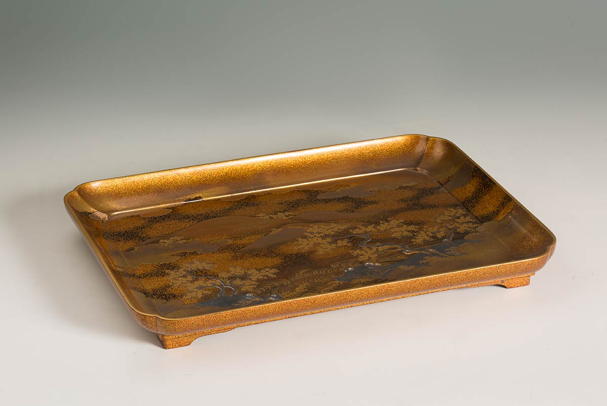 La superficie a vista lavorata con varie tecniche del maki-e (“pittura a oro cosparsa”), la decorazione raffigurante una scena di paesaggio con un corso d'acqua in basso e colline con alberi di ciliegio in fiore.