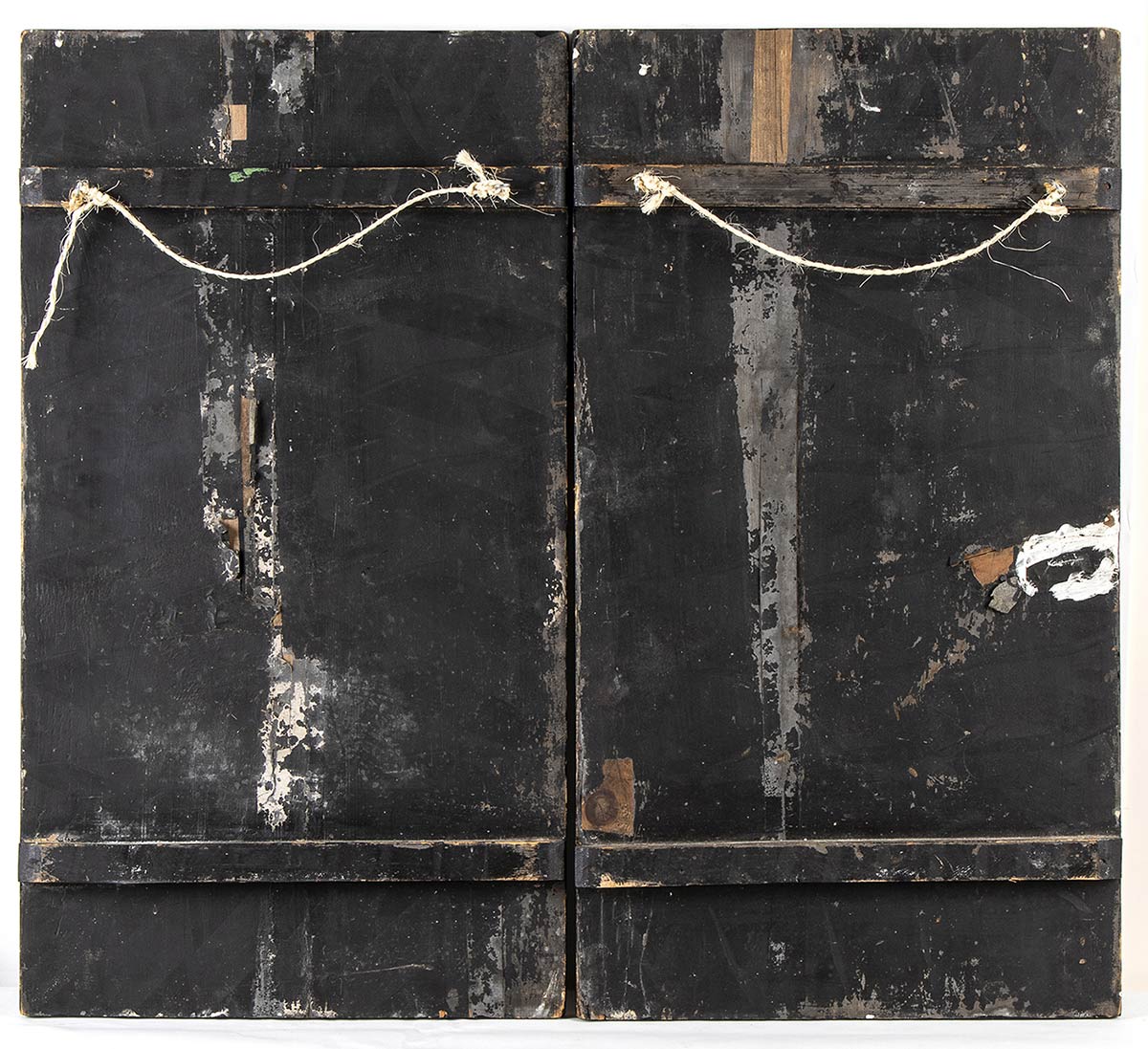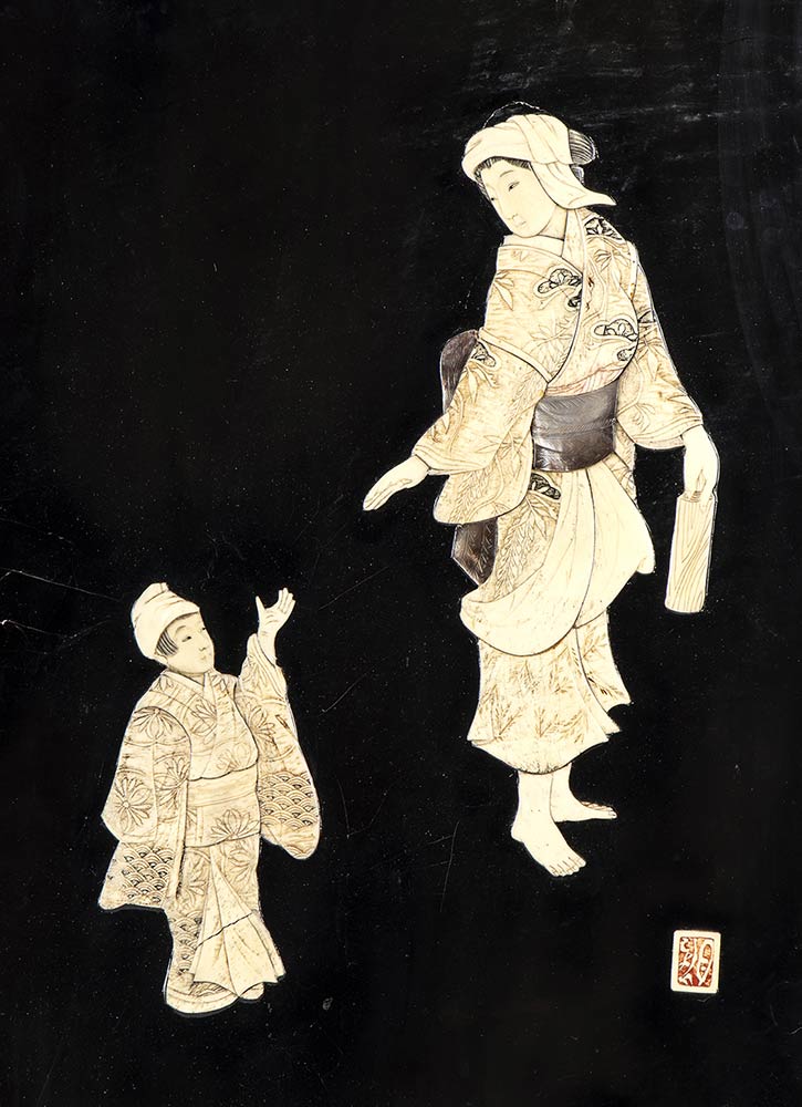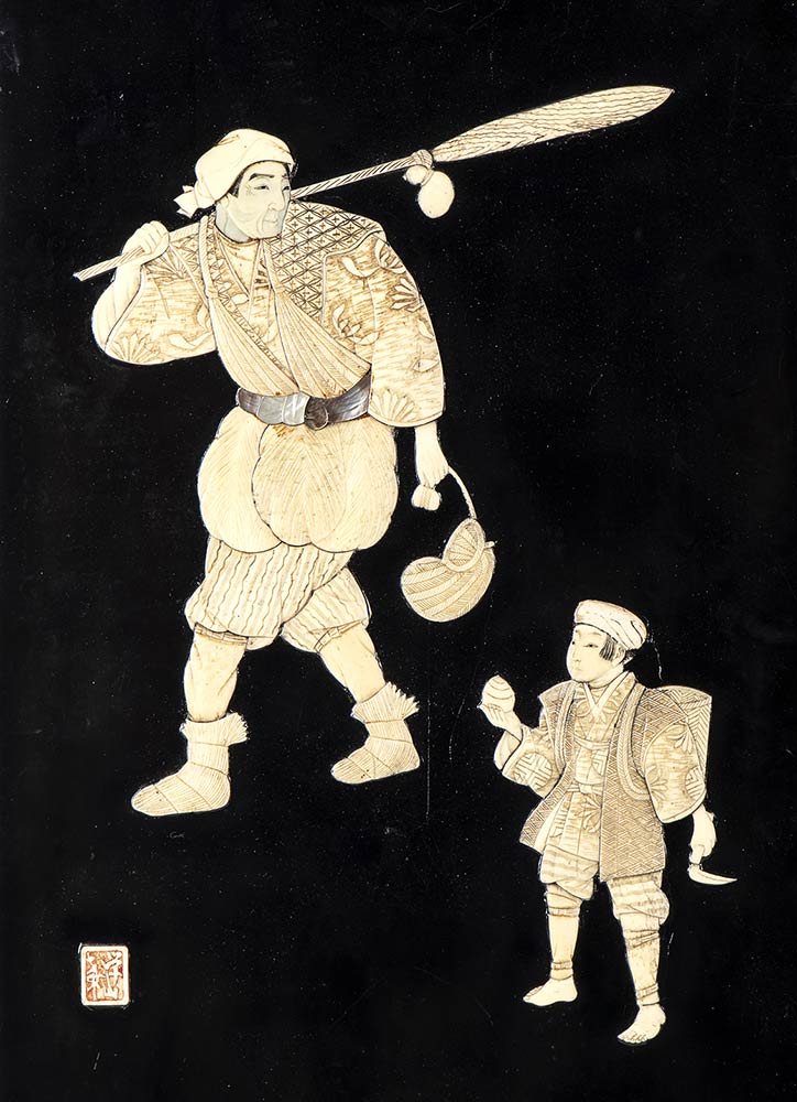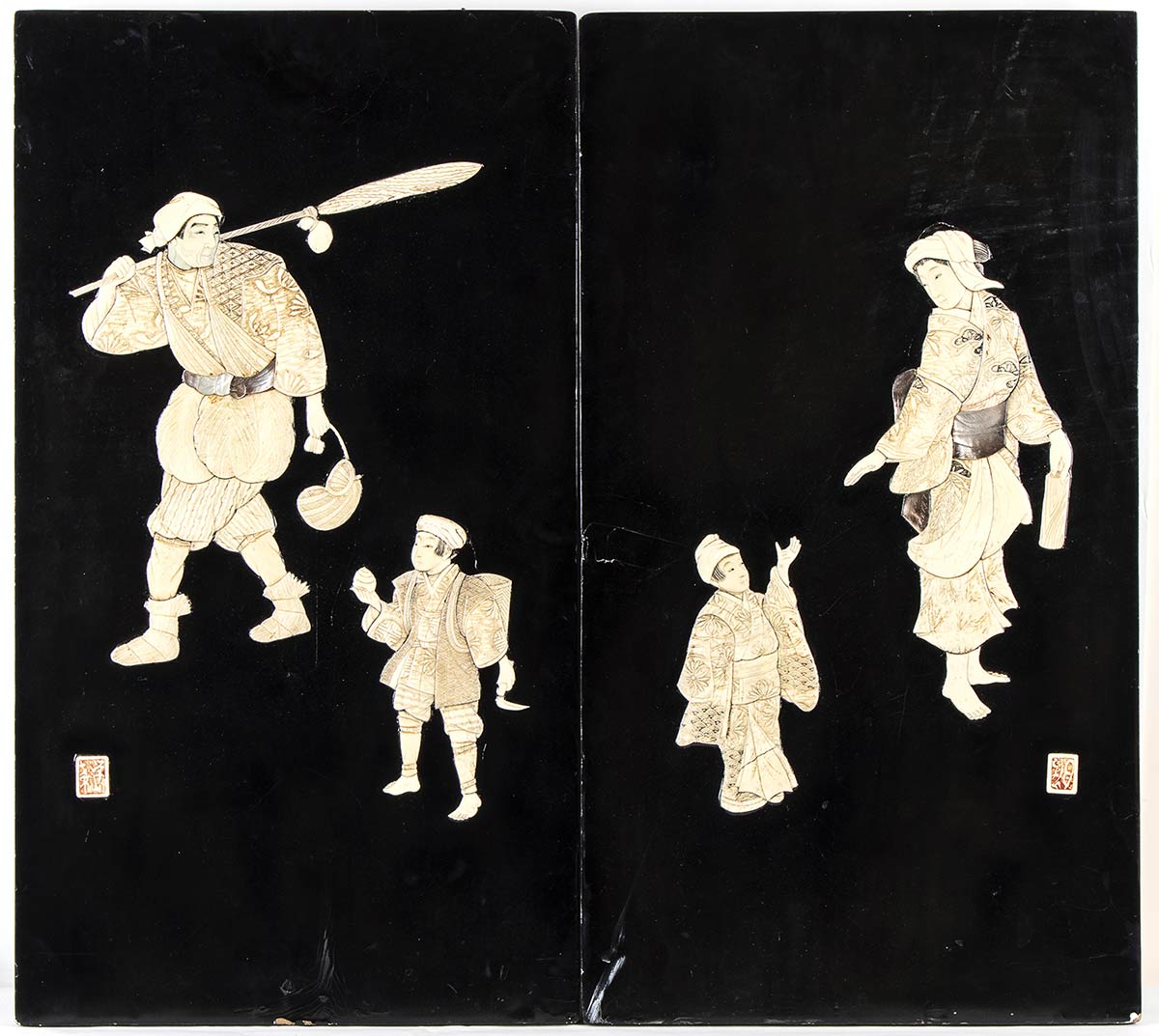 Di forma rettangolare, i due pannelli presentano sul fondo a lacca nera una fine decorazione a intarsio di avorio e madreperla, su uno con un artigiano accompagnato da un bambino e sull'altra con una donna accompagnata da una bambino, su entrambi in basso un sigillo.