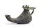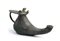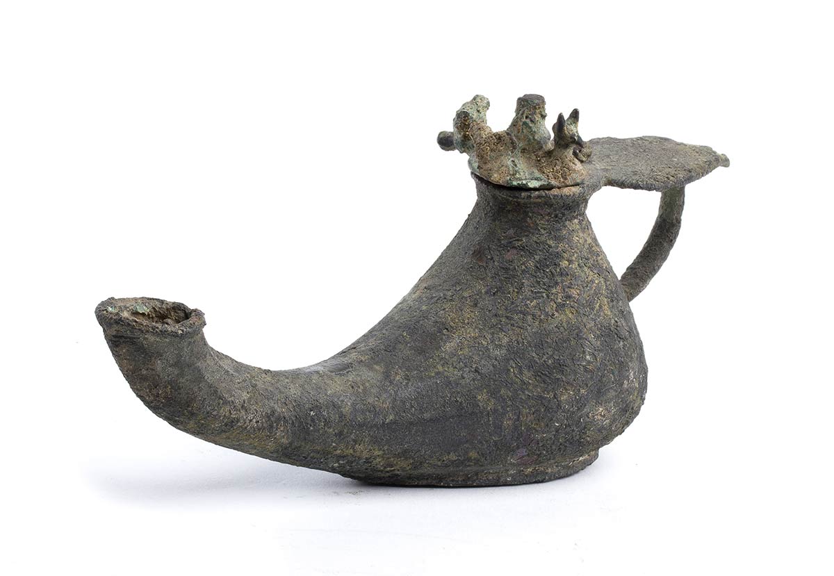 Serbatoio di forma globulare, da cui si dipana il lungo cannellino per il fuoco, presa ad orecchio alla quale si attacca coperchietto del serbatoio ornato di tre figure zoomorfe a tutto tondo che servono da presa.