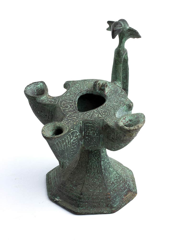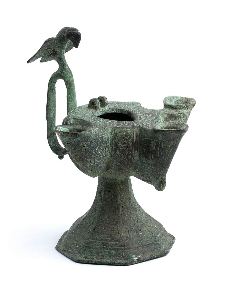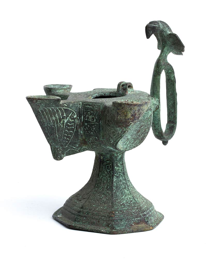 LAMPADA A OLIO A TRE FUOCHI IN BRONZO CON DECORO INCISO<br>Iran, Khorasan, XII-XIII secolo<br><br>