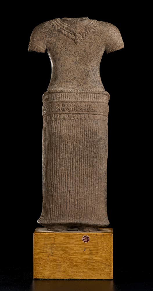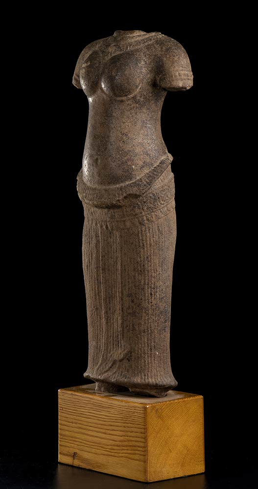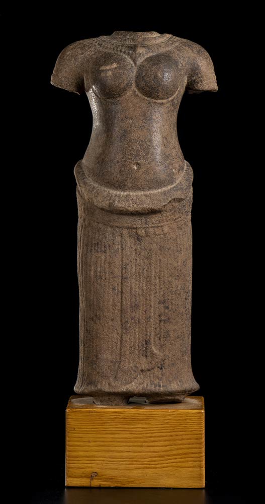 SCULTURA DI DIVINITÀ FEMMINILE IN PIETRA<br>Khmer, stile Angkor Vat, XII secolo