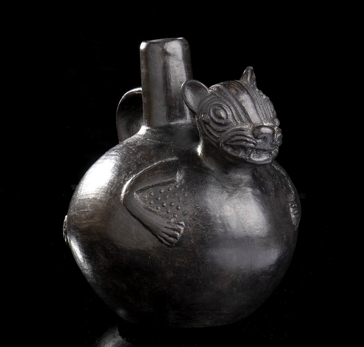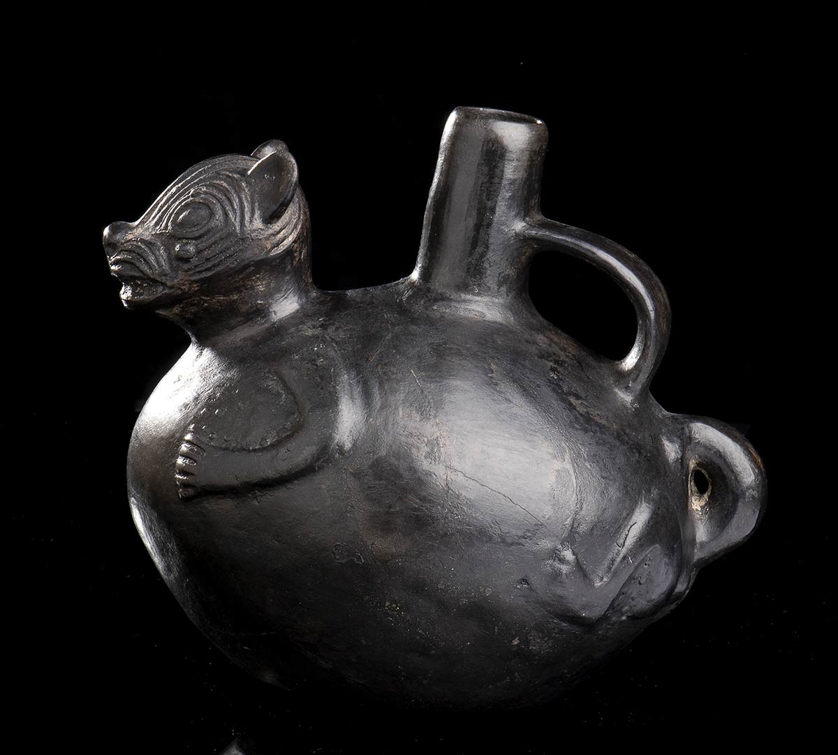 CONTENITORE ZOOMORFO IN CERAMICA NERA<br>Perù, cultura Chimu