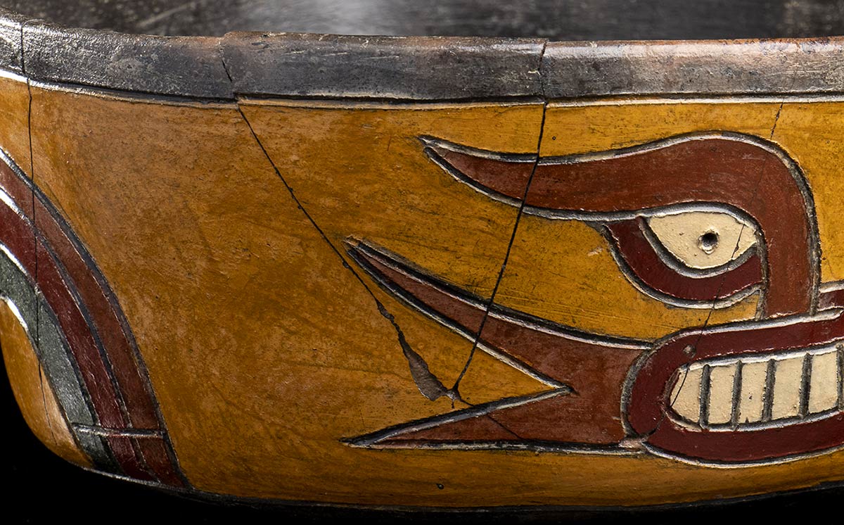 A sezione circolare, presenta sull'esterno una decorazione in viva policromia e incisione con un rettile stilizzato.