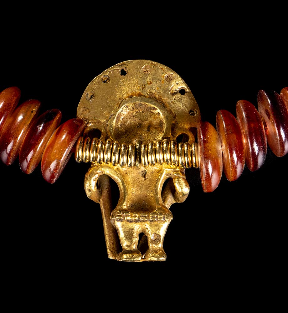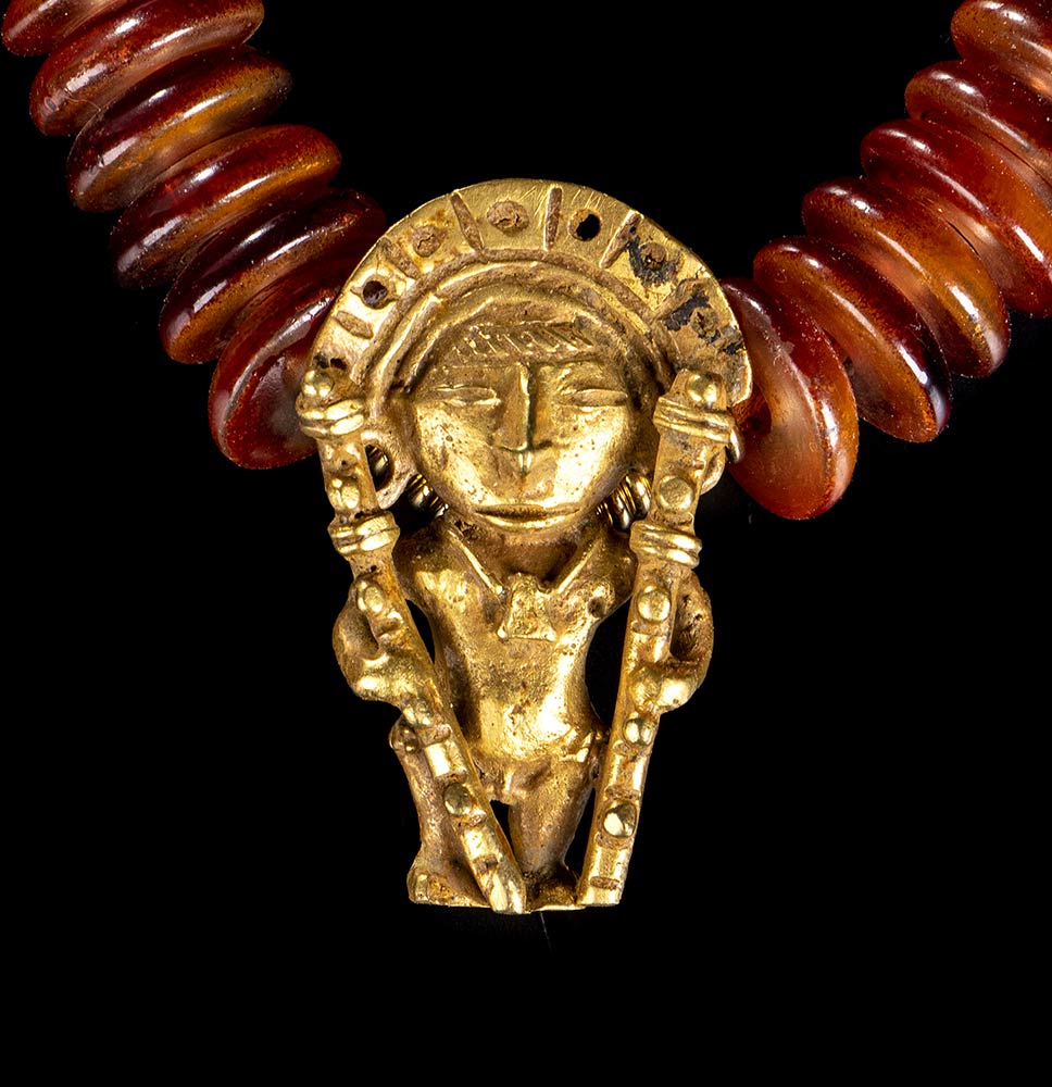 COLLANA DI BEADS CON PENDENTE ANTROPOMORFO IN LEGA DI ORO<br>Stile precolombiano