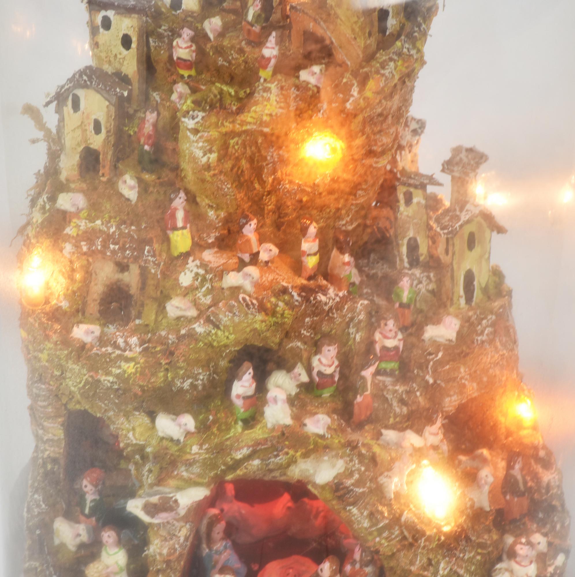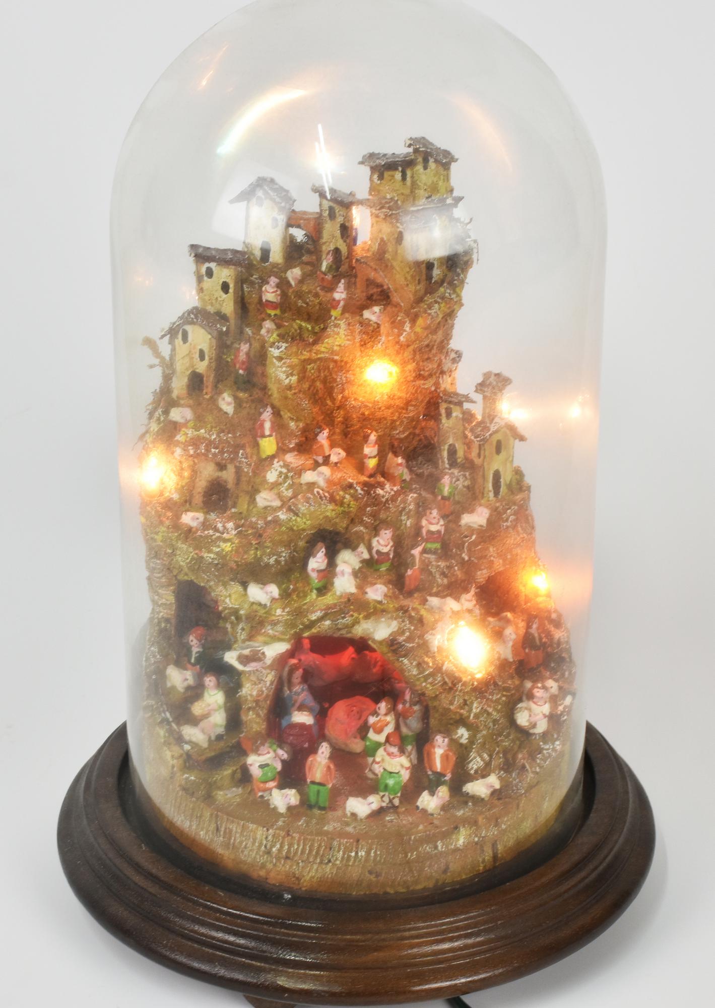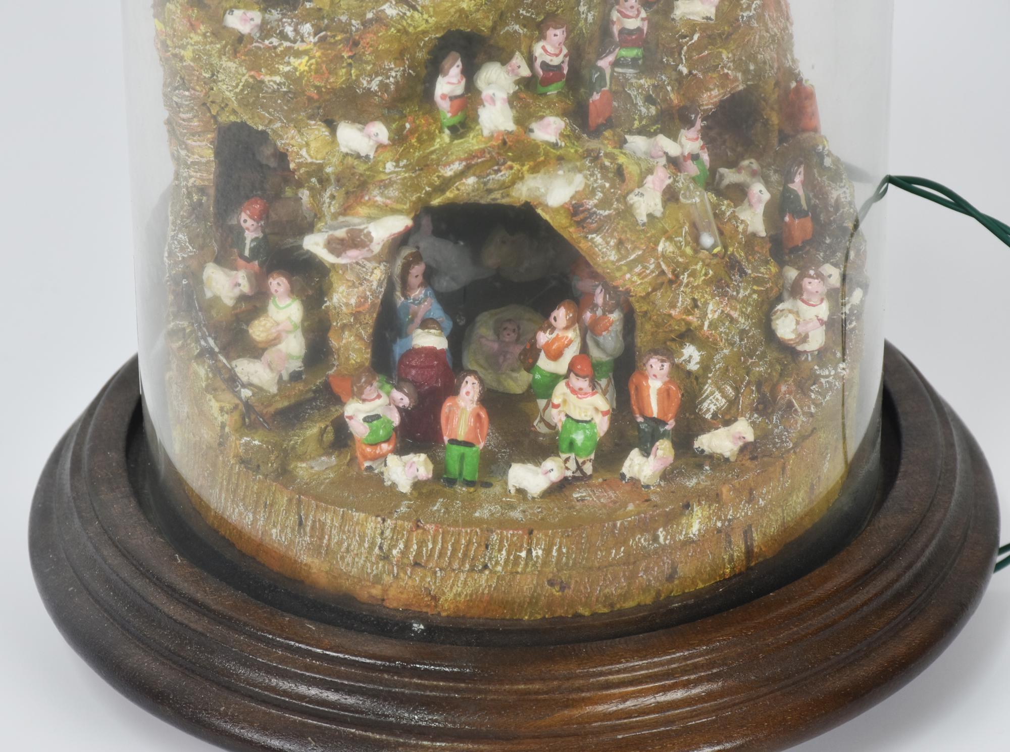 PRESEPE IN SUGHERO entro teca in vetro, con impianto di illuminazione...