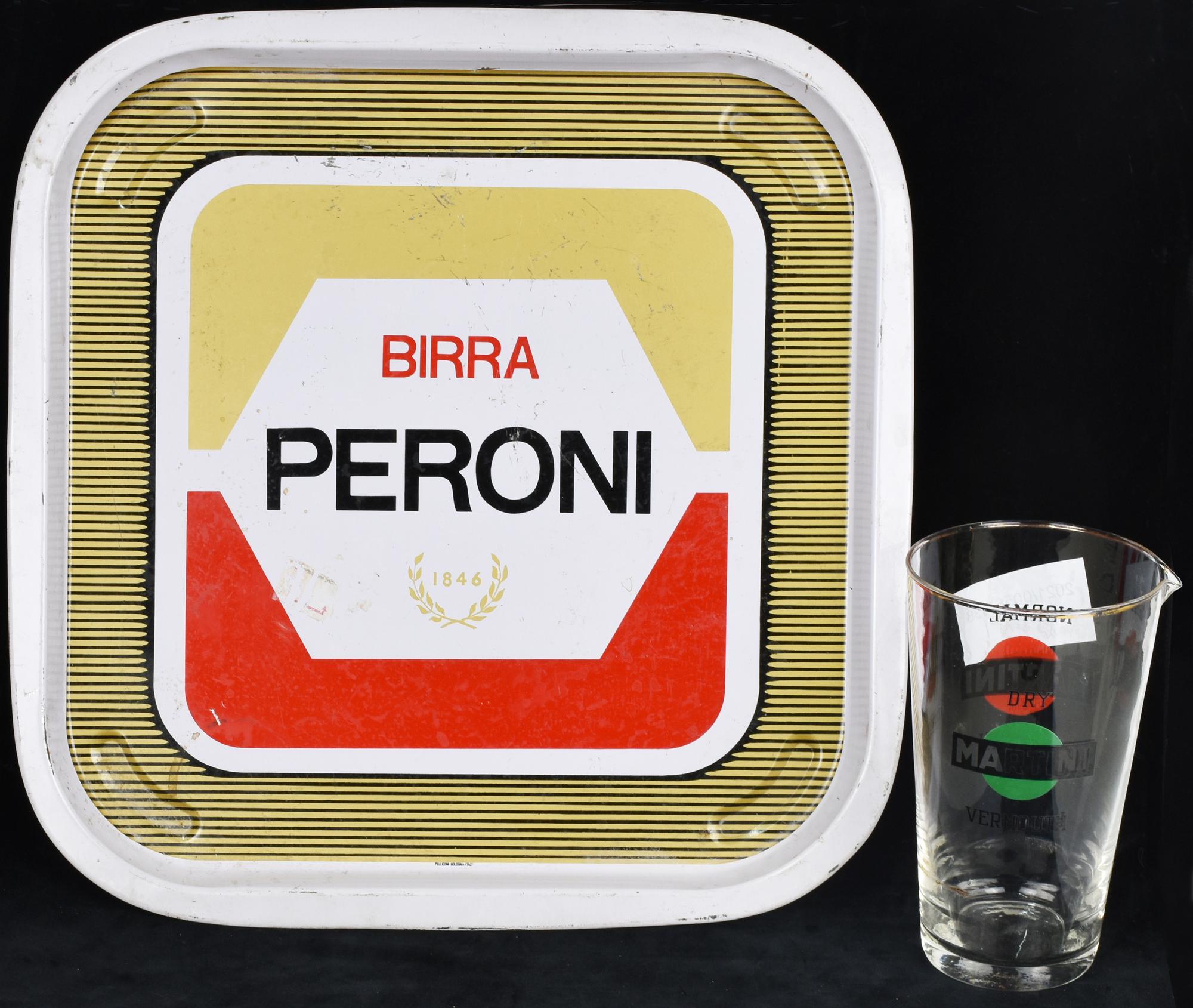 composto da: shaker in vetro Martini e vassoio Birra Peroni in metallo
