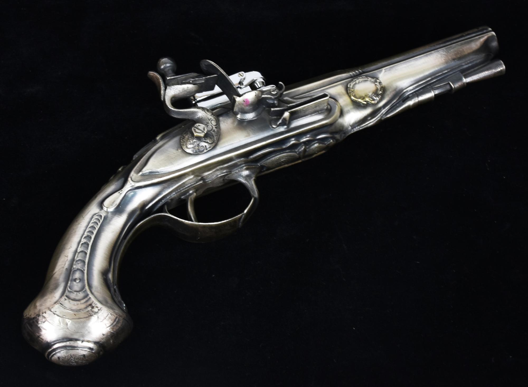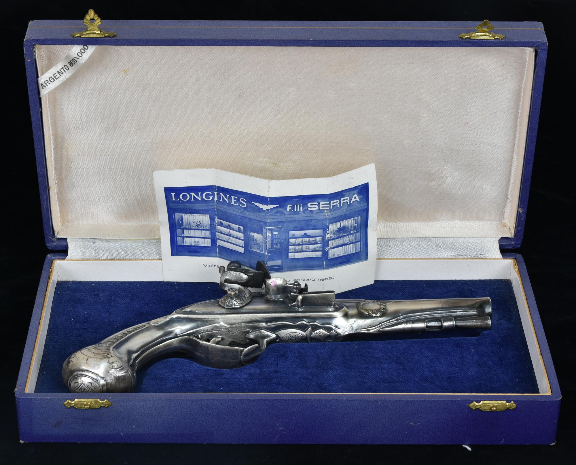 Lotto 129 | PISTOLA ACCENDISIGARI in metallo argentato e brunito completa di astuccio...