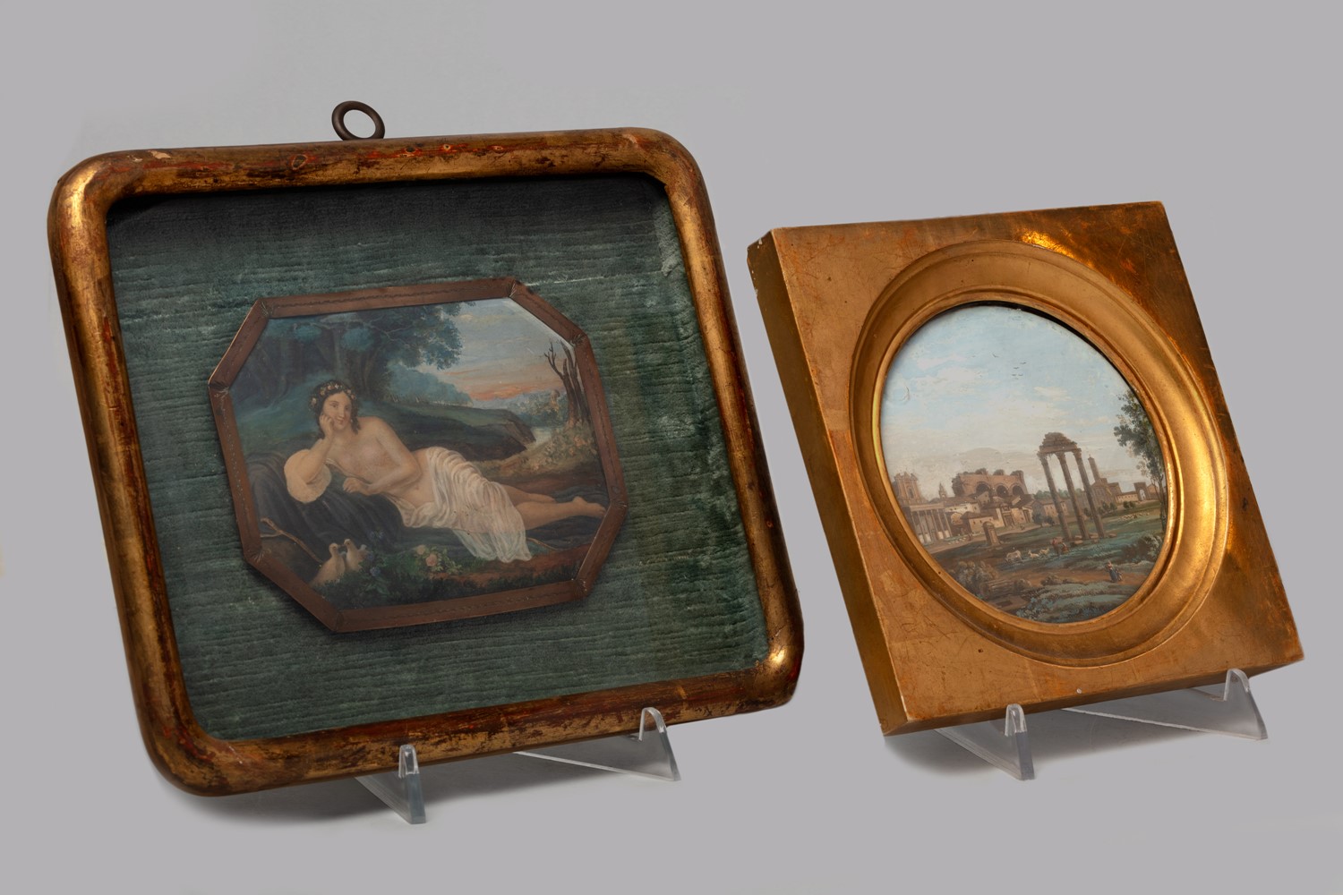 una raffigurante Campo Vaccino a Roma (in tondo) e una raffigurante nudo femminile disteso in un paesaggio (in ottagono)una raffigurante Campo Vaccino a Roma (in tondo) e una raffigurante nudo femminile disteso in un paesaggio (in ottagono)