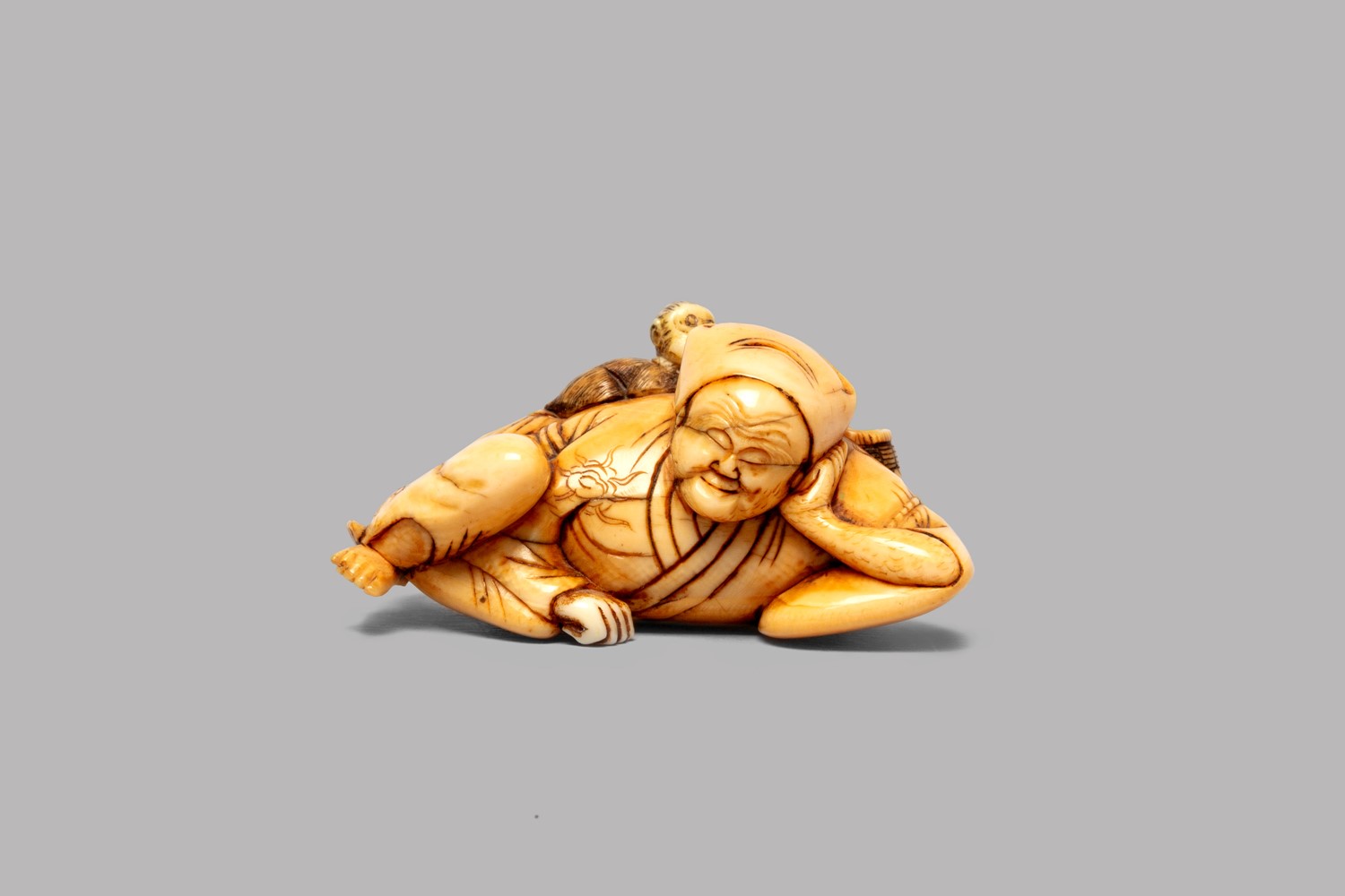 Netsuke in avorio raffigurante uomo disteso con scimmia, Giappone periodo Edo, secoli XVIII-XIX
