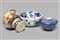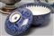 Una ciotola con coperchio in porcellana bianca e blu, altezza cm 5,5 e diametro cm 11;