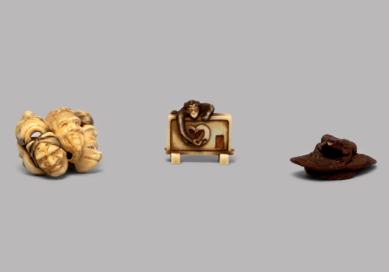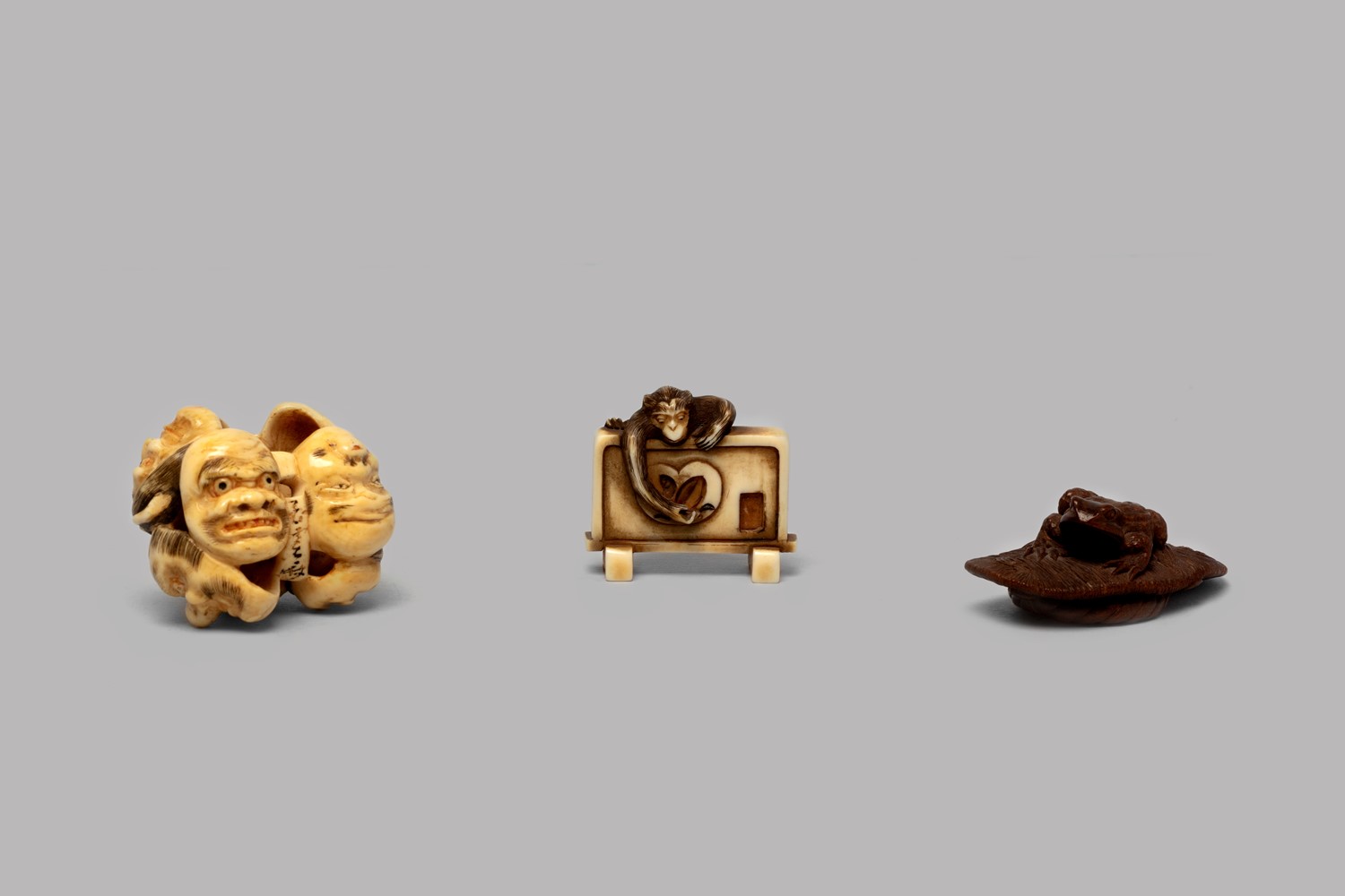 Un netzuke in avorio raffigurante 7 teste; Un netzuke in avorio raffigurante scimmia su paravento e un okimono in legno a forma di sandalo con rana, firmato