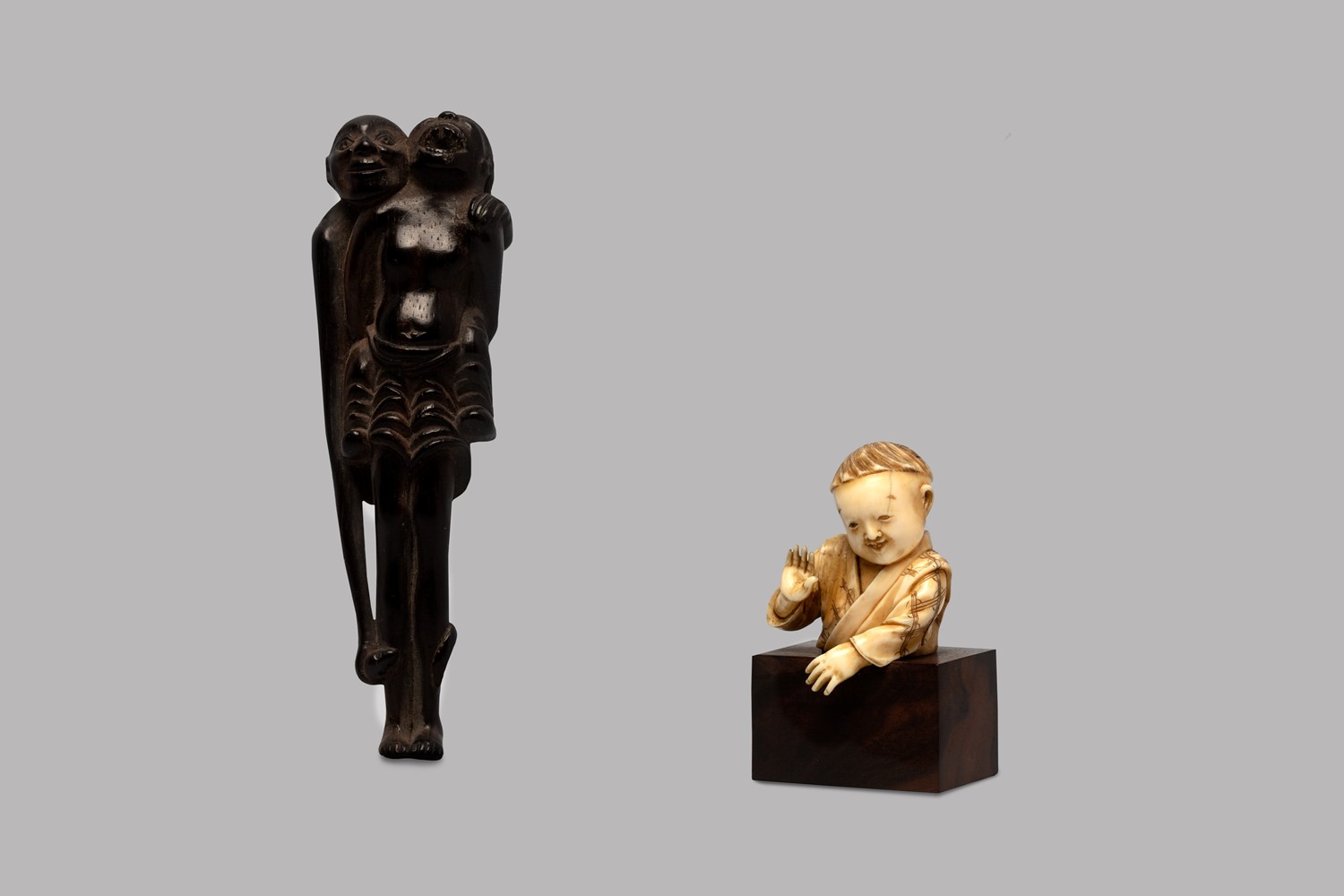 Lotto composto da un okimono in avorio e un netzuke in legno raffigurante Ashinaga e Tenega, Giappone periodo Meiji