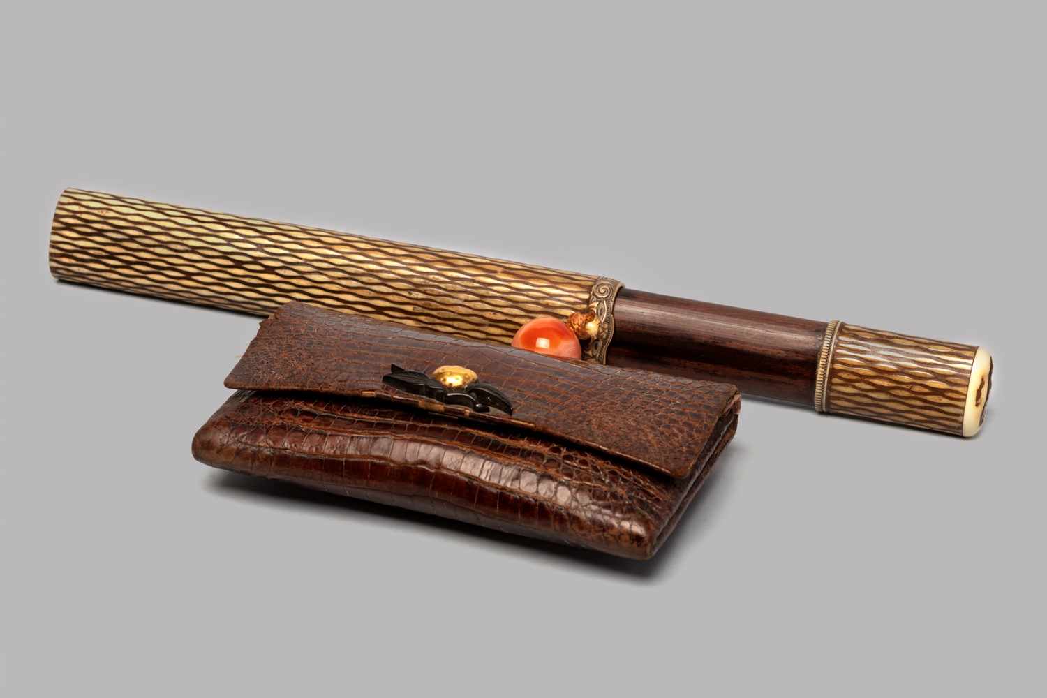 Lotto 392 | Kiseru in corno di cervo porta pipa con porta tabacco in pelle, Giappone periodo Edo