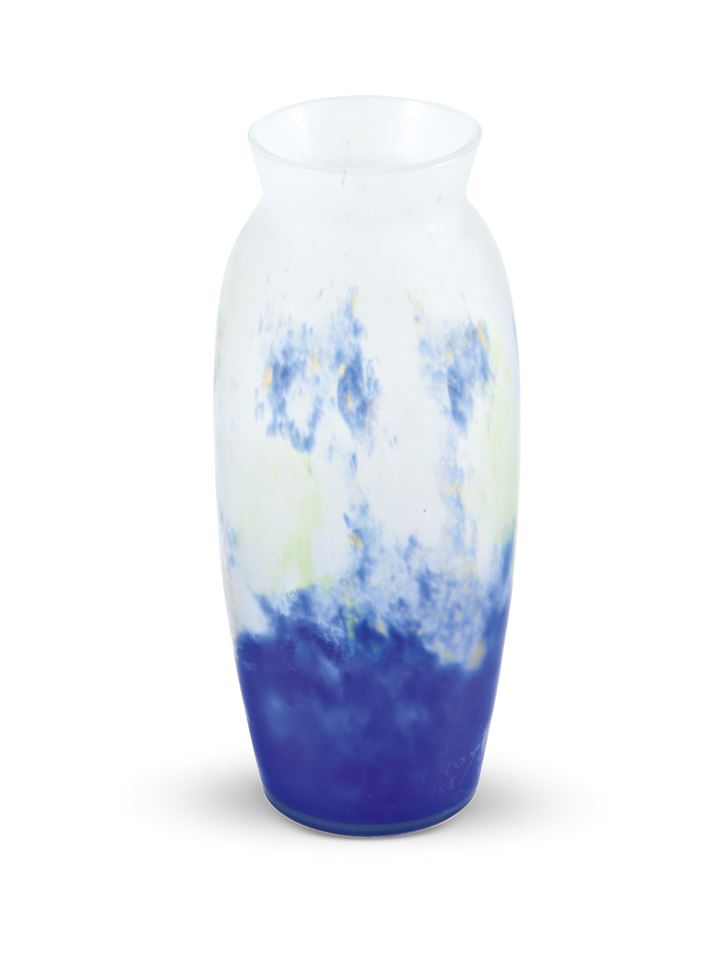 Vaso in vetro ovoidale nei toni del bianco satinato marmorizzato blu. Firma al getto di sabbia Noverdy