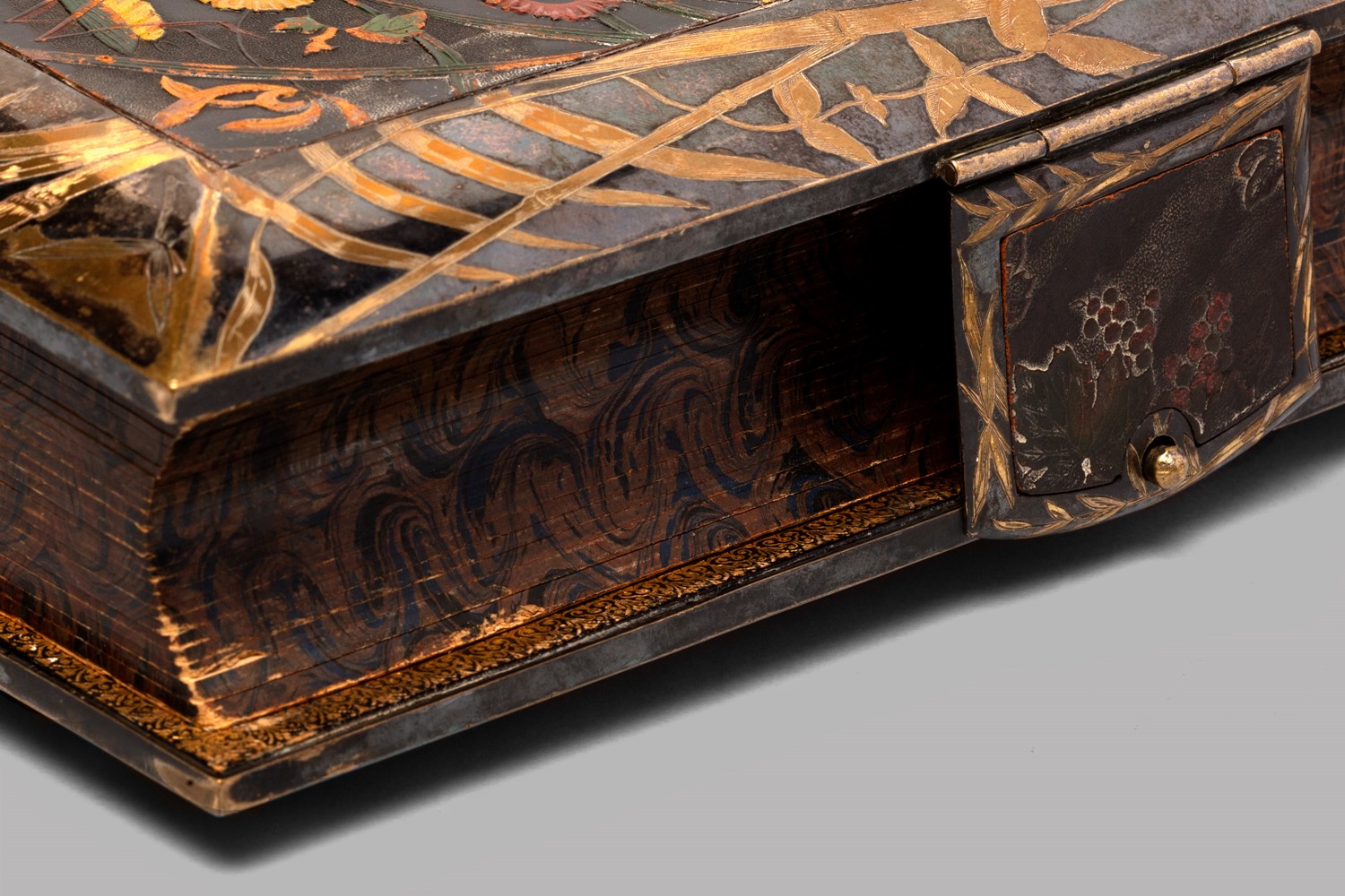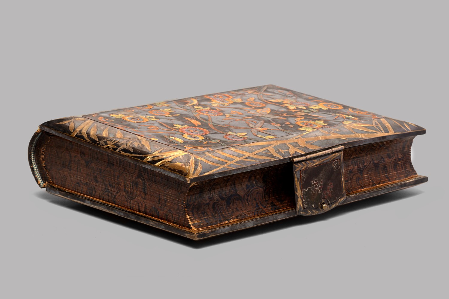 Album portafoto, Giappone, periodo Meiji, con decori in metallo raffiguranti bambù e farfalle e copertina in cuoio con fiori, farfalle e grilli