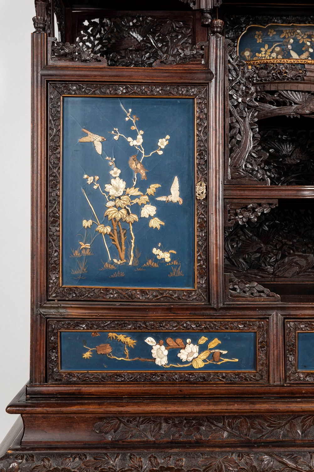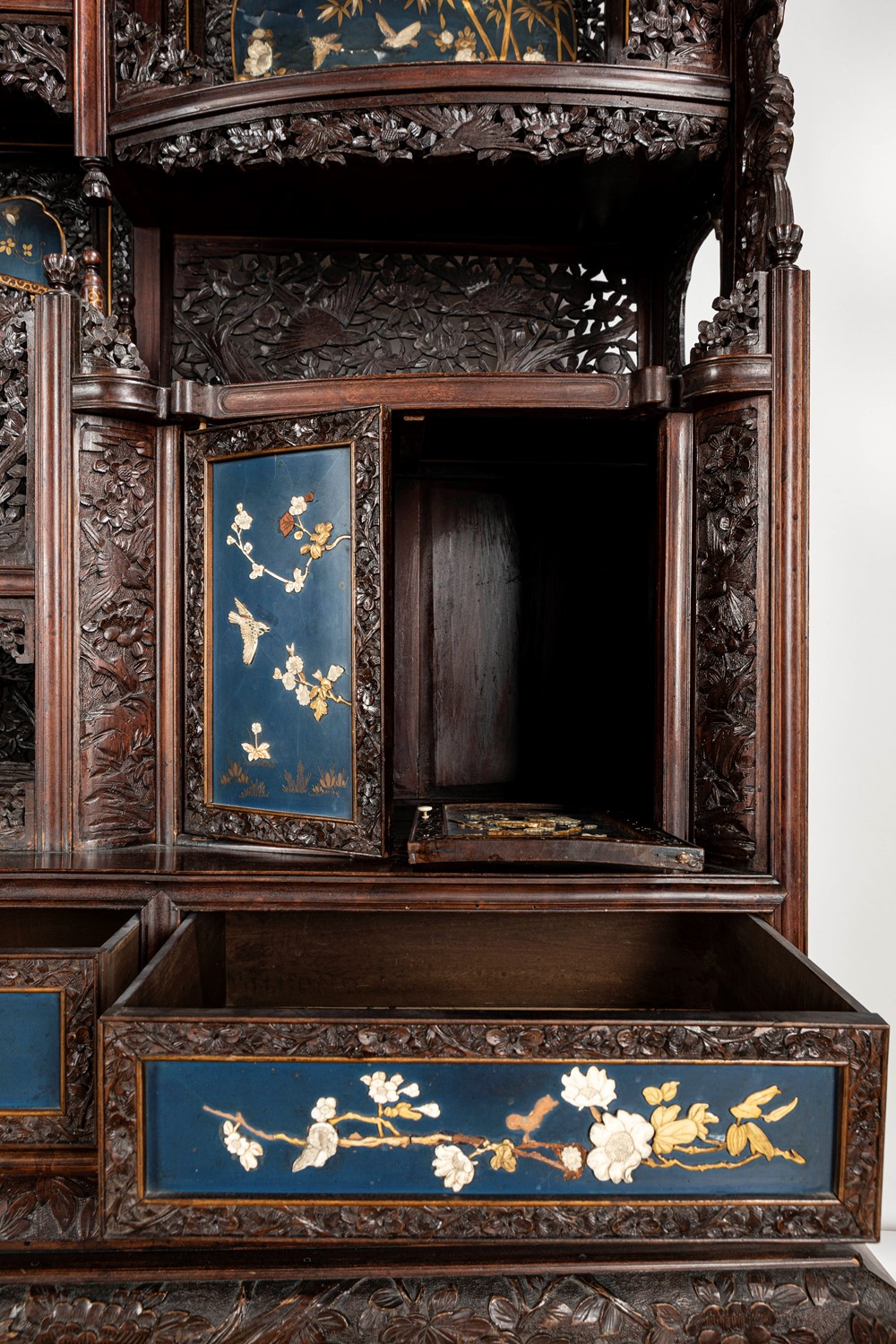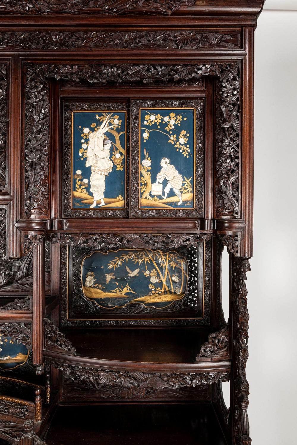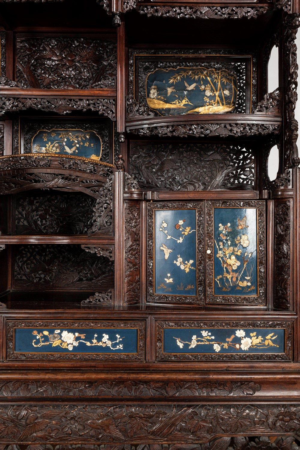 Mobile Shibayama decorato con pannelli in lacca blu con intarsi in avorio e madreperla, Giappone periodo Meiji