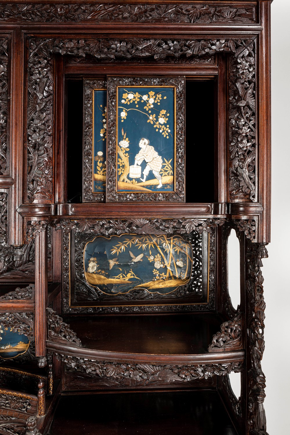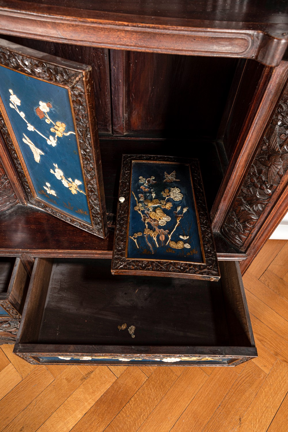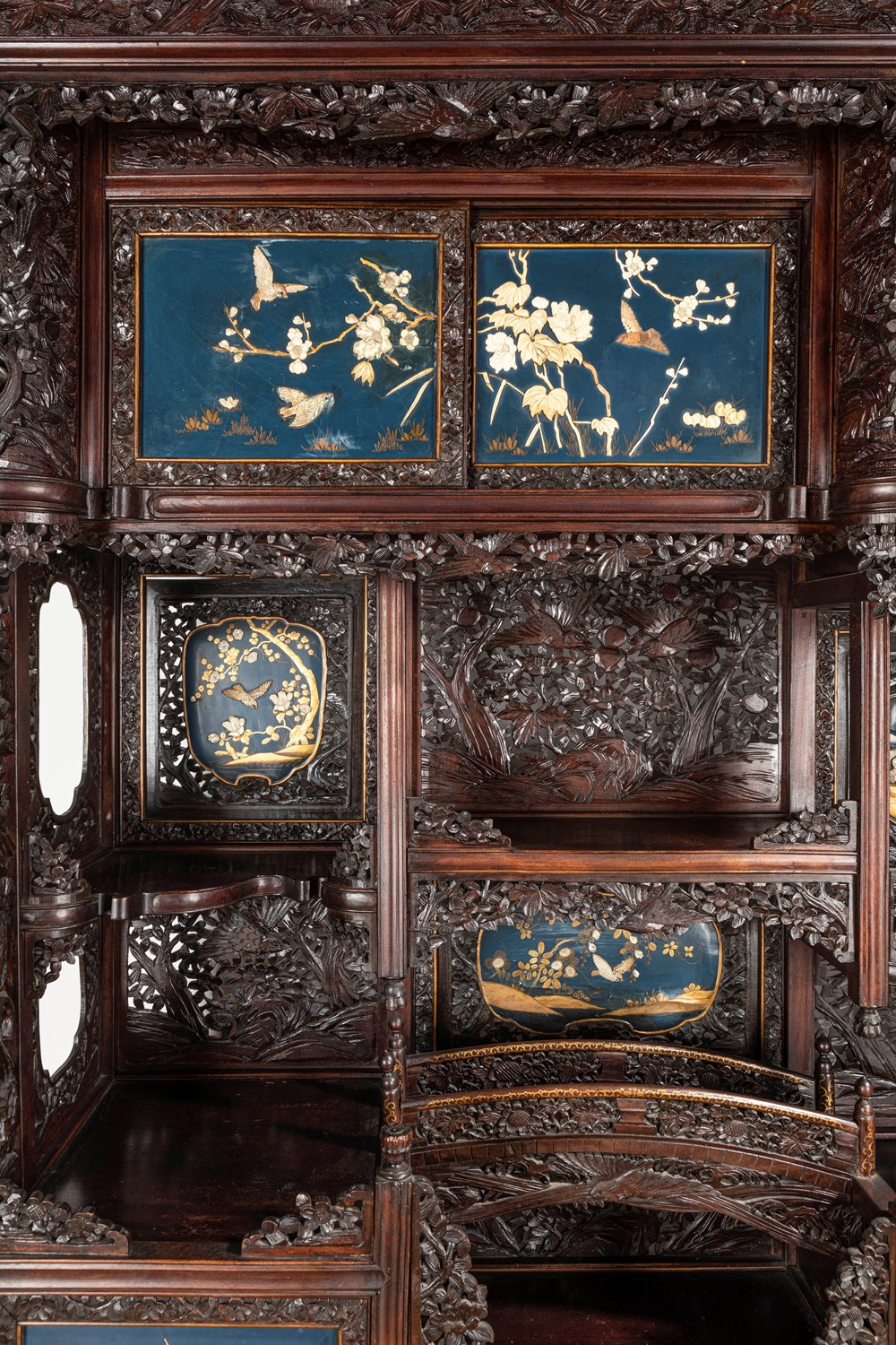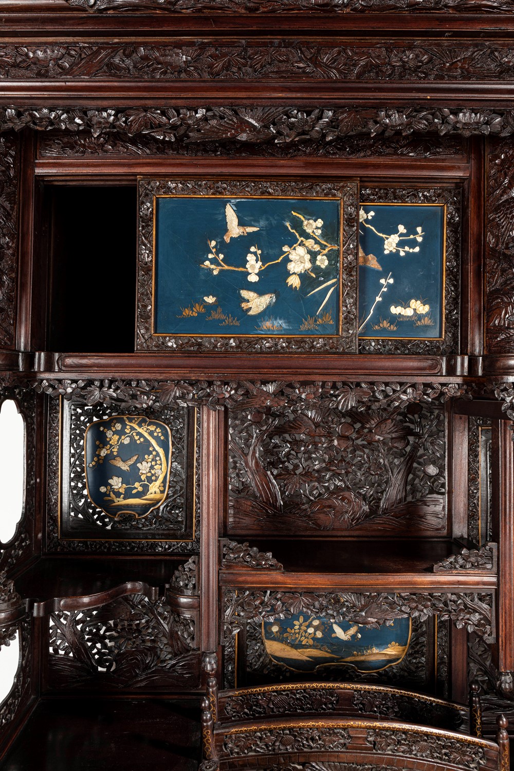 Mobile Shibayama decorato con pannelli in lacca blu con intarsi in avorio e madreperla, Giappone periodo Meiji