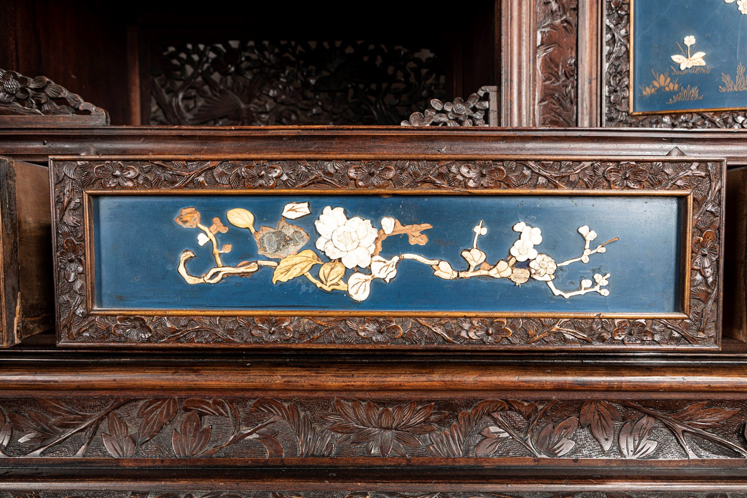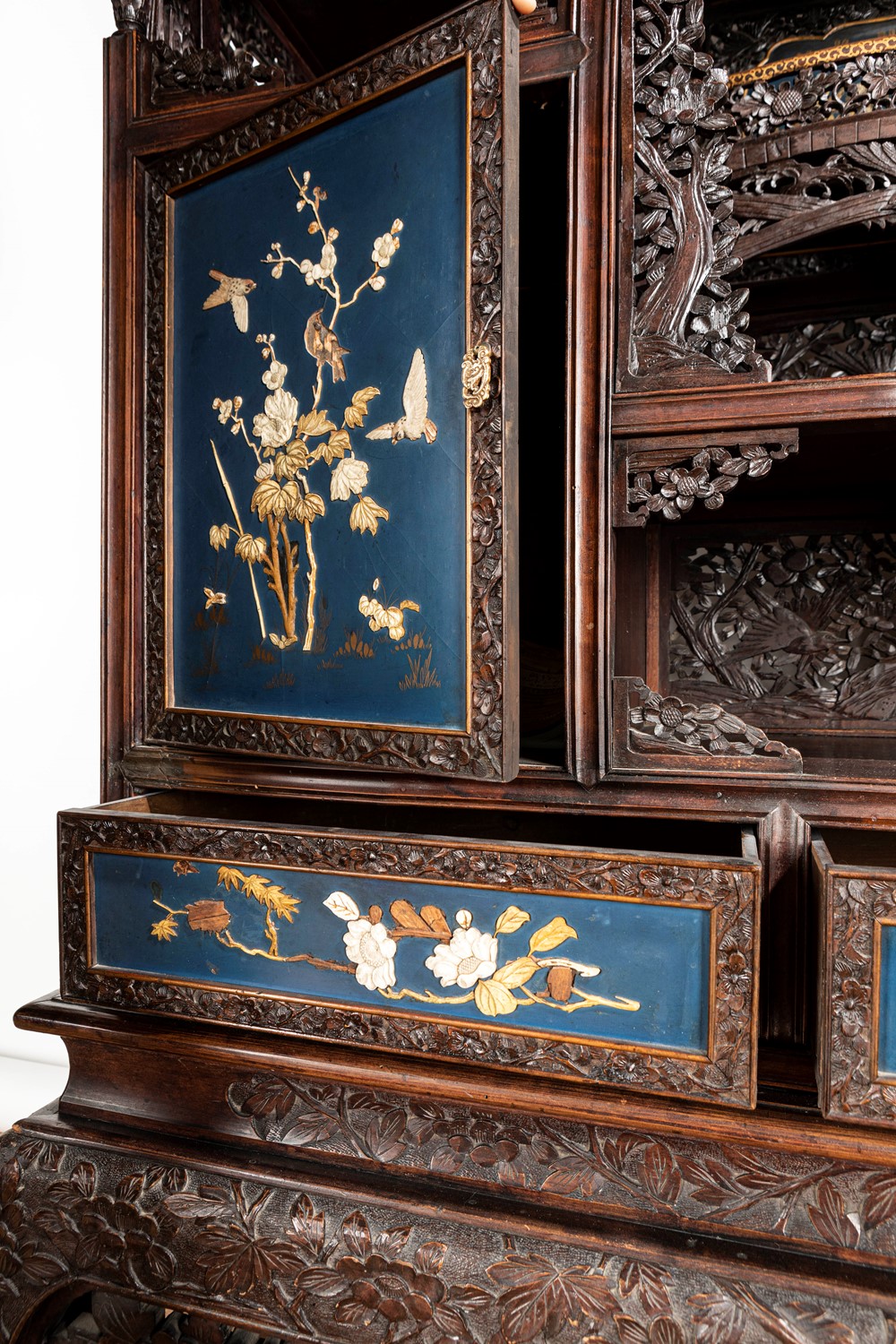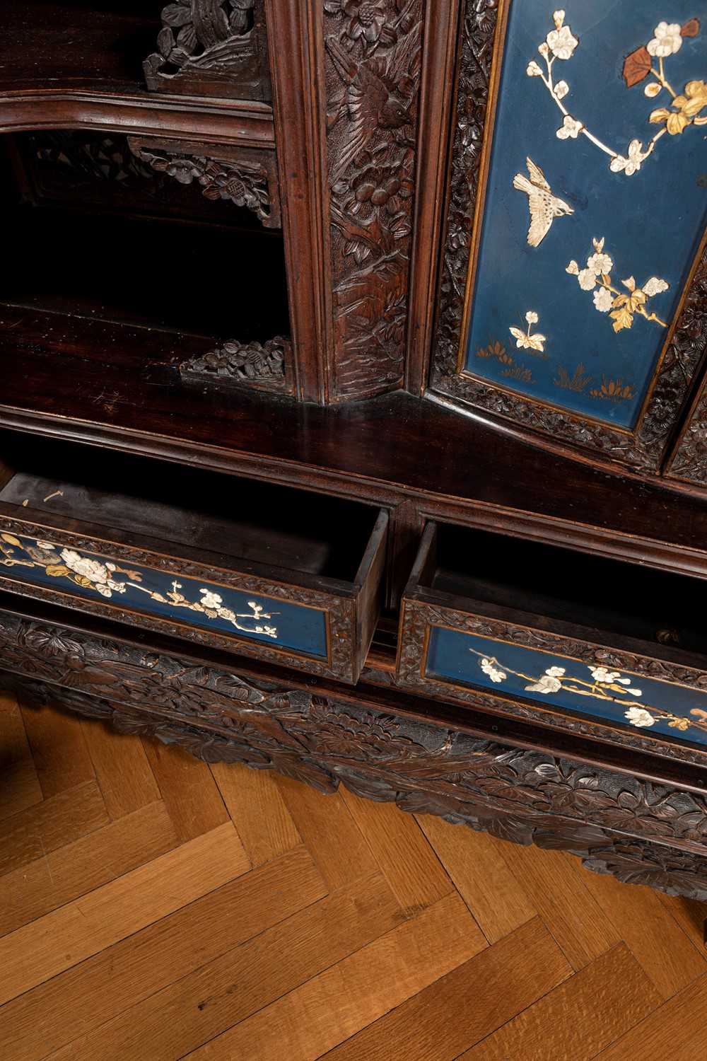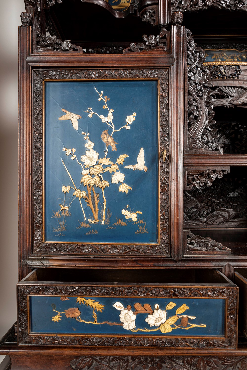 Mobile Shibayama decorato con pannelli in lacca blu con intarsi in avorio e madreperla, Giappone periodo Meiji