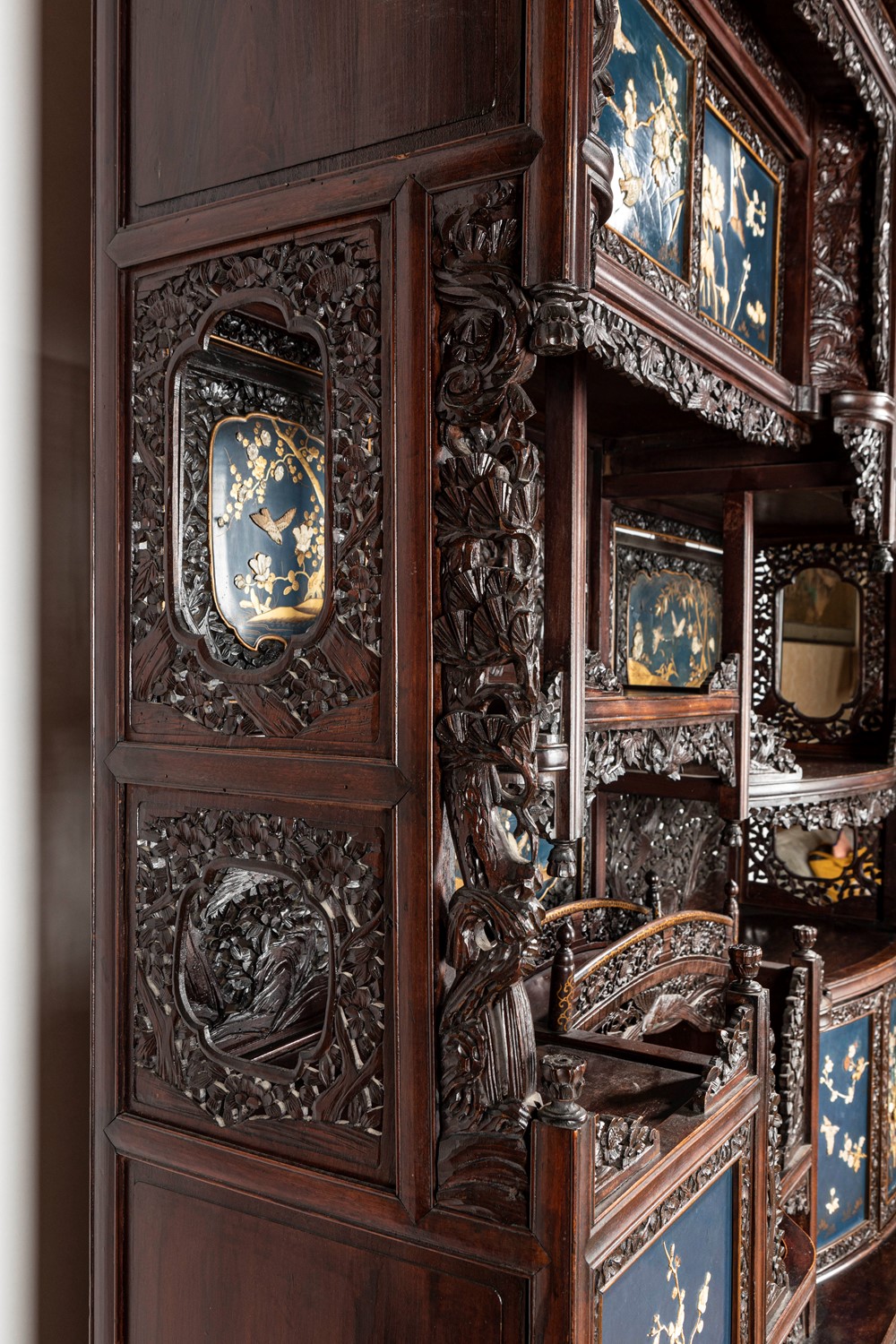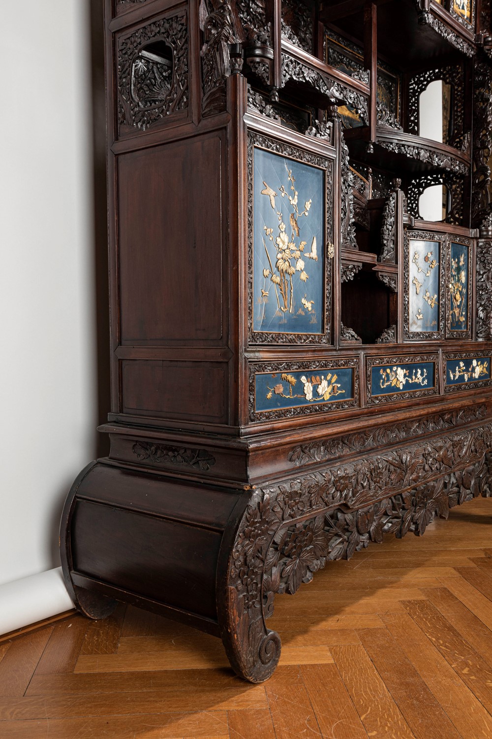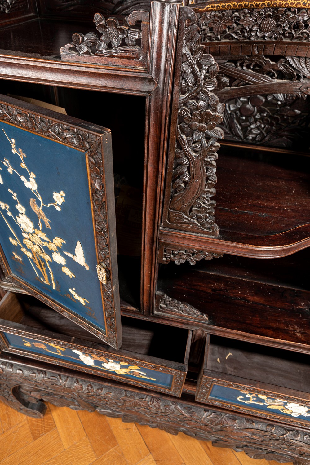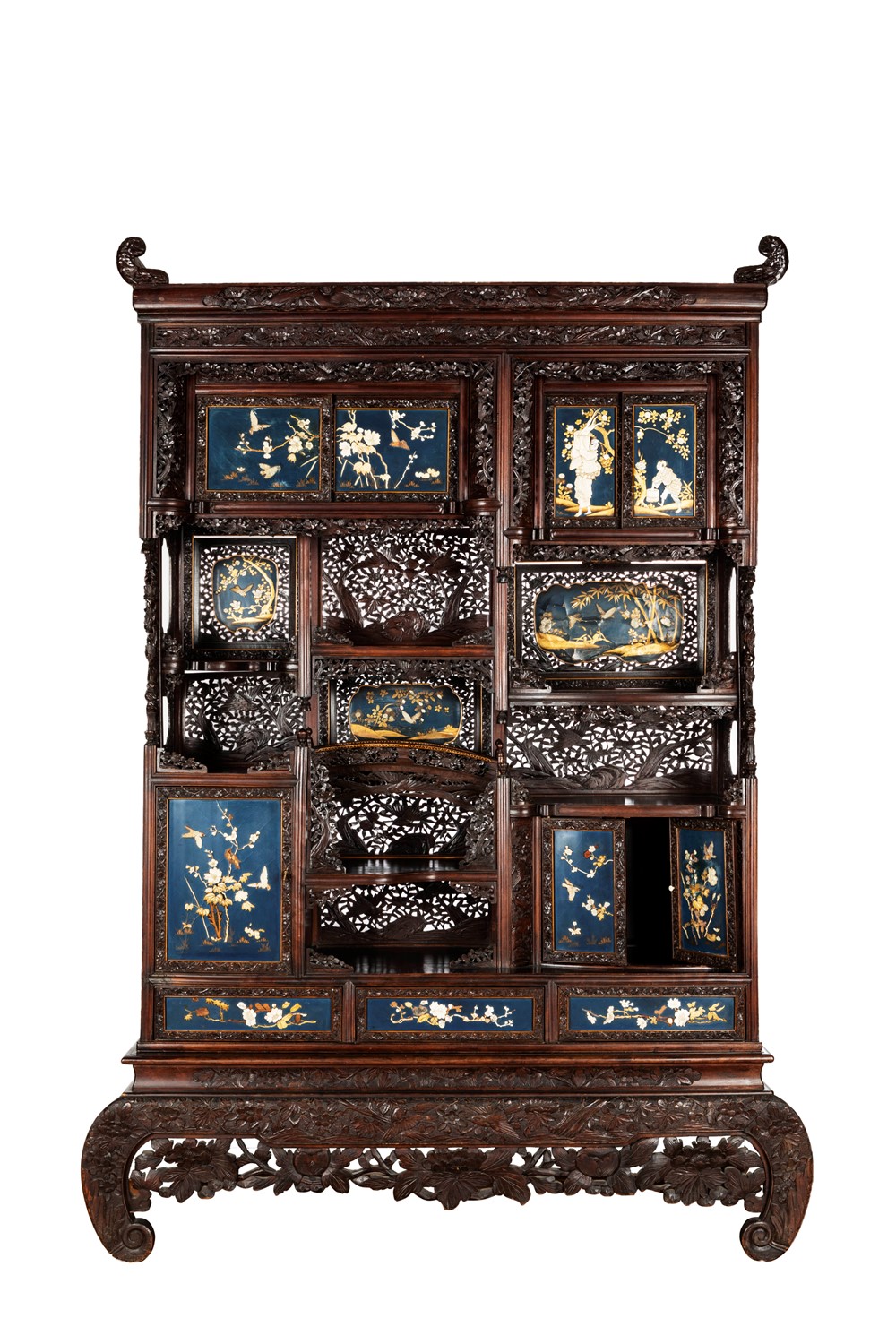 Mobile Shibayama decorato con pannelli in lacca blu con intarsi in avorio e madreperla, Giappone periodo Meiji