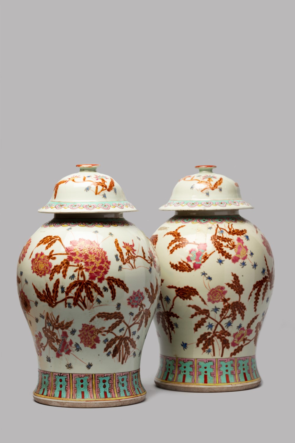 Coppia di vasi in porcellana policroma con coperchio, Cina secolo XX