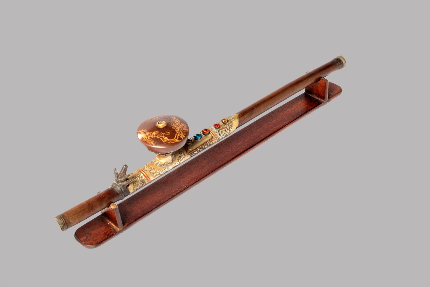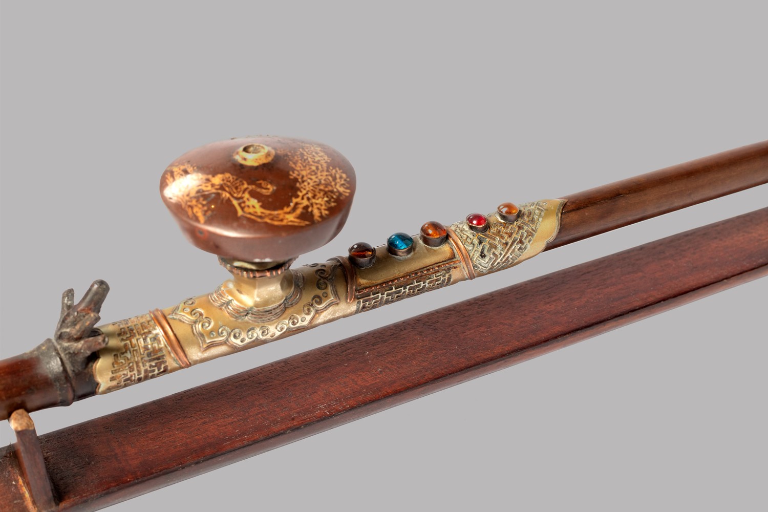 Pipa da oppio in bamboo con applicazioni in rame e vetri cabochon, estremità in giadeite e fornello in pietra dura con decorazioni in oro, Cina dinastia Qing