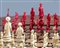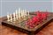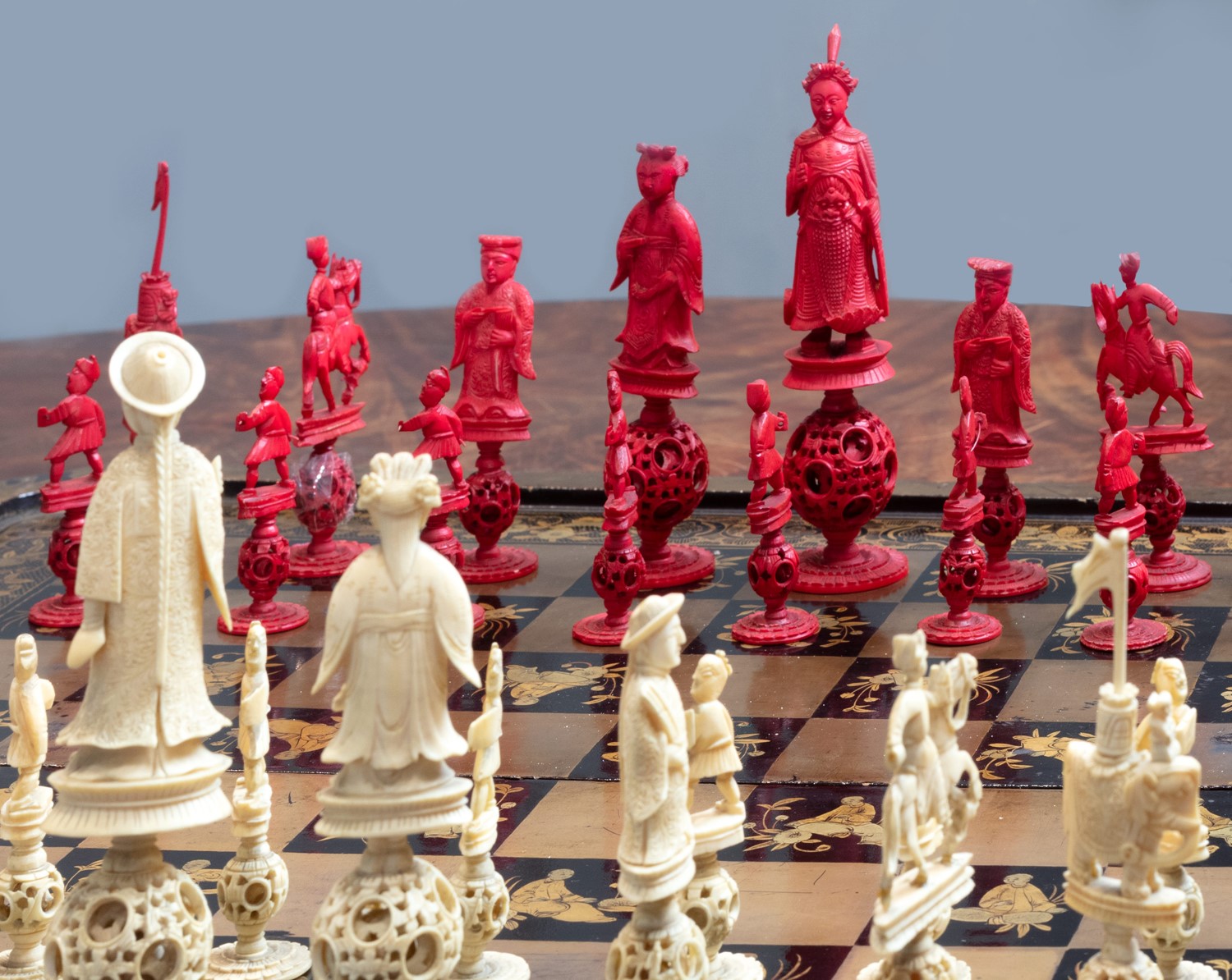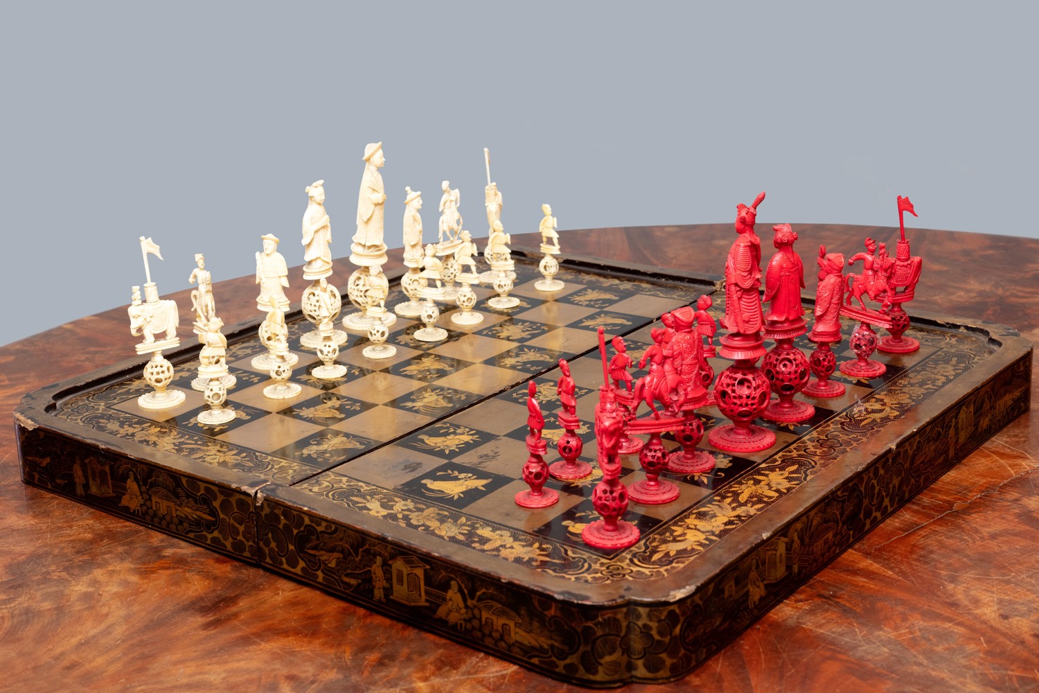 Scacchiera in legno laccato e oro, con pezzi in avorio bianco e avorio tinto rosso, Cina Canton, seconda metà del secolo XIX