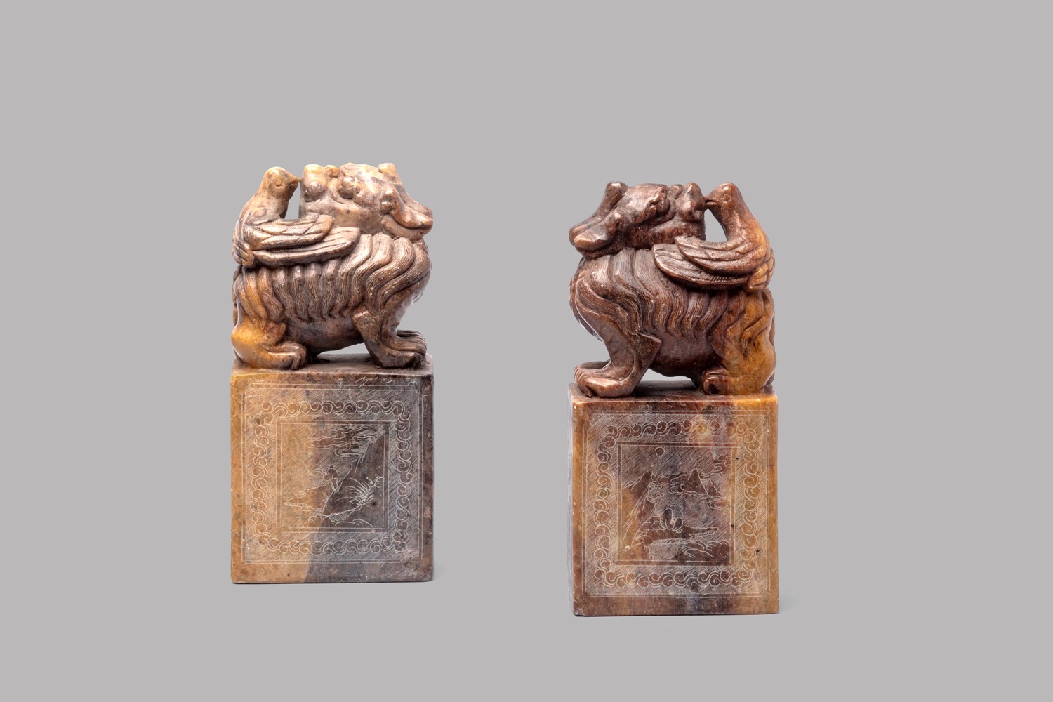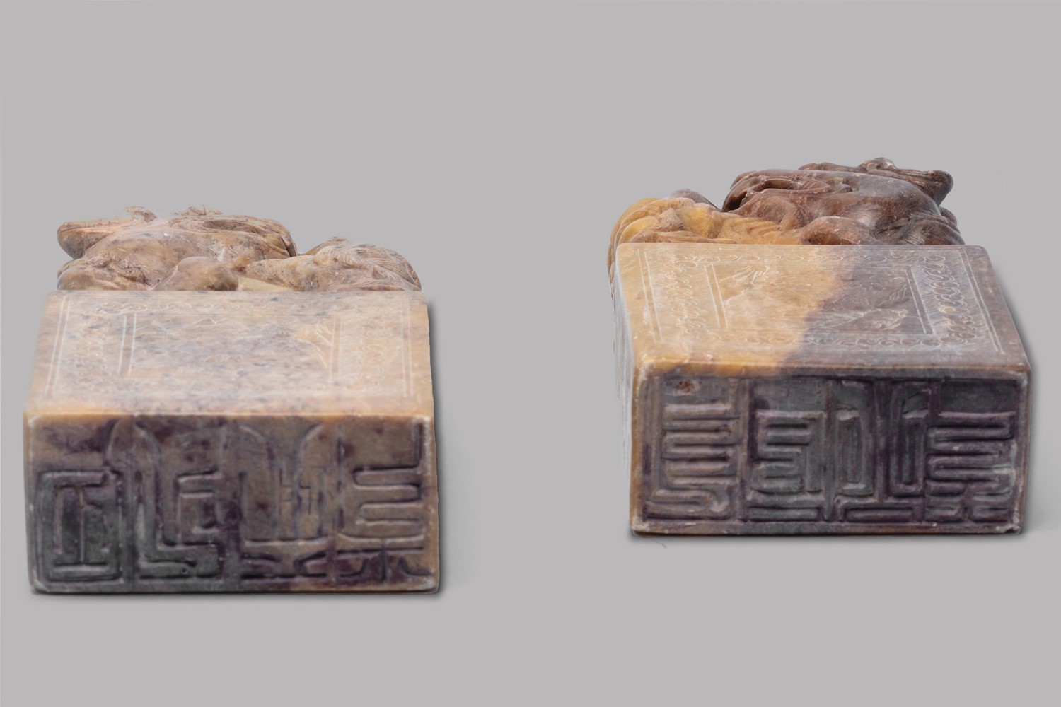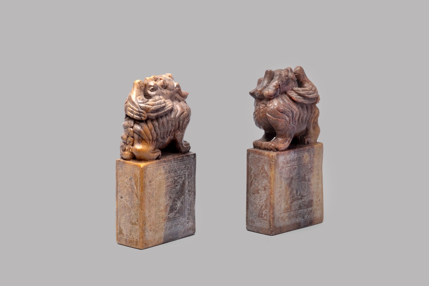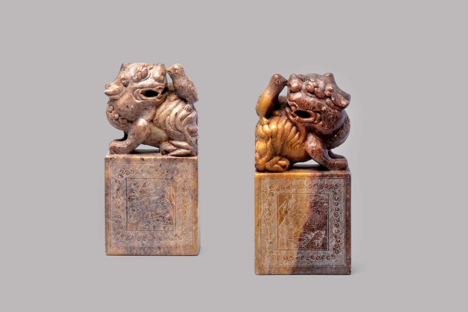Coppia di sigilli in pietra saponaria, sormontati da cani di Pho, Cina dinastia Qing