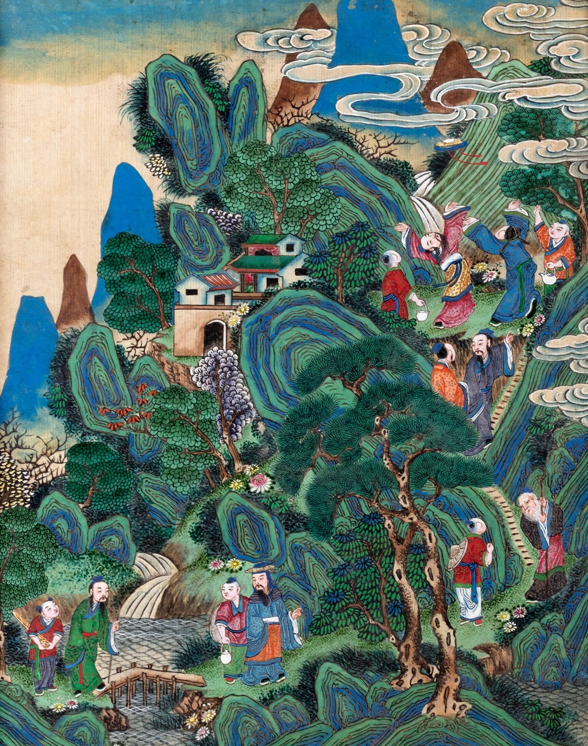 Dipinto su seta raffigurante paesaggio con figure, Cina secolo XIX