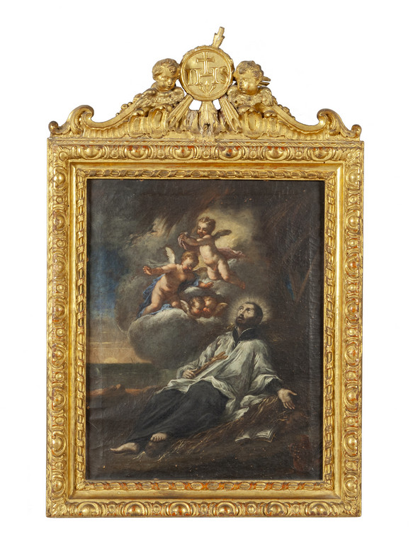 Scuola piemontese sec.XVII 'Santo in estasi' olio splendida cornice coeva in legno intagliato e dorato con parte superiore sormontata da angeli