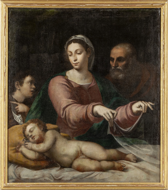 Scuola genovese sec.XVII 'Madonna con Bambino con in mano un cardellino ai lati San Giovanni e San Giuseppe' olio