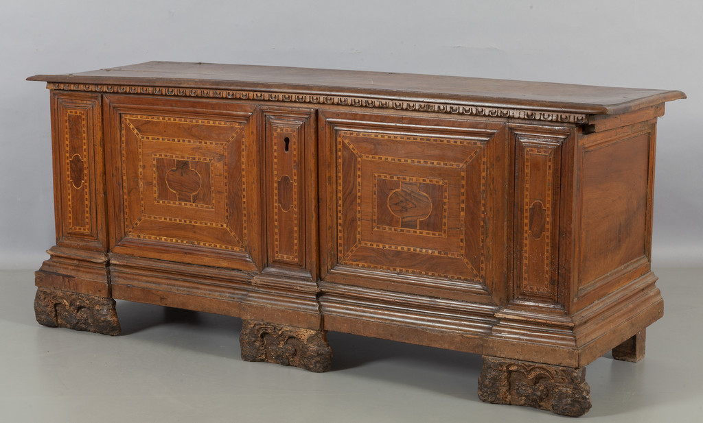 Cassapanca in noce intarsiata con filetti Lombardia I metà sec. XVIII