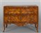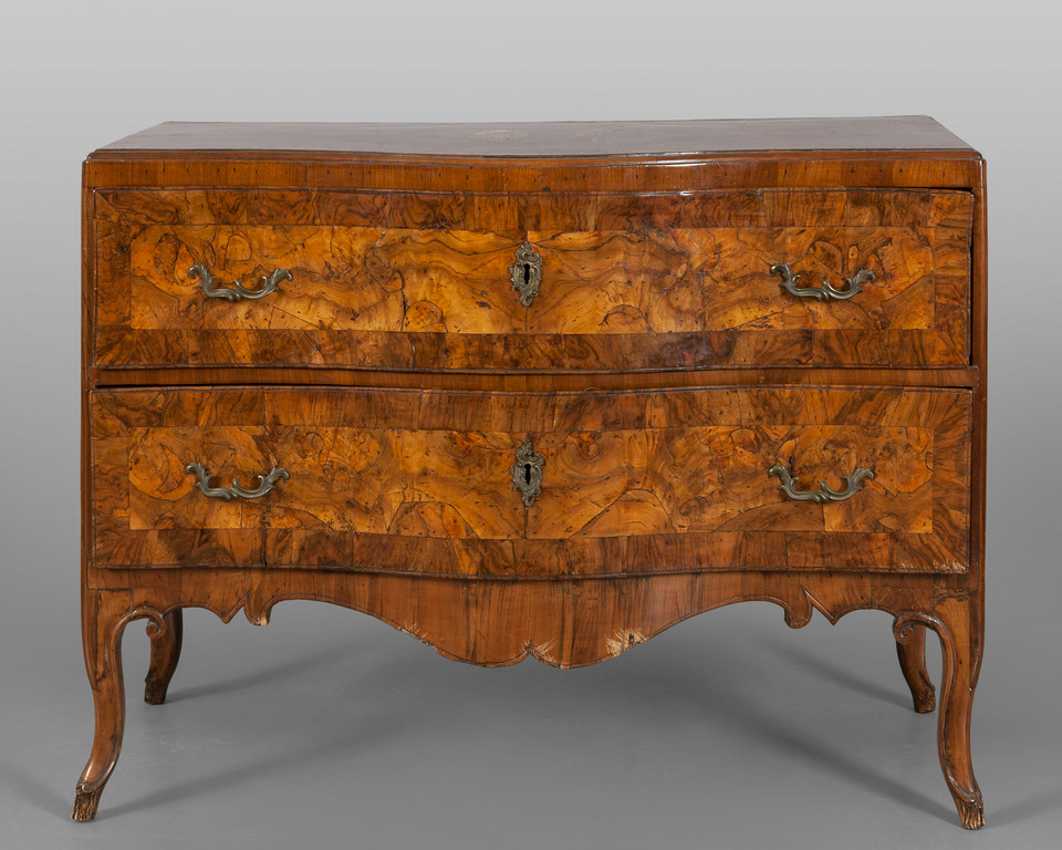 Comò Luigi XIV movimentato sul fronte con due grandi cassetti lastronato in noce e radica di noce piano lastronato con scena centrale Veneto sec.XVIII