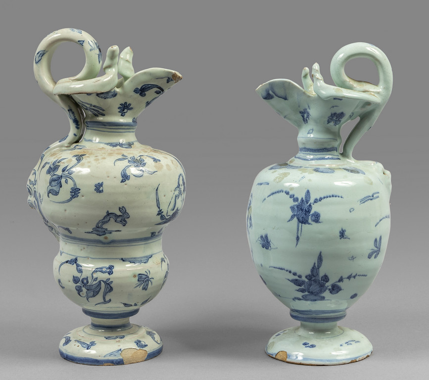 Due versatoi in ceramica decorazione a tappezzeria in blu su fondo bianco marca Stemma Savona sec.XVIII