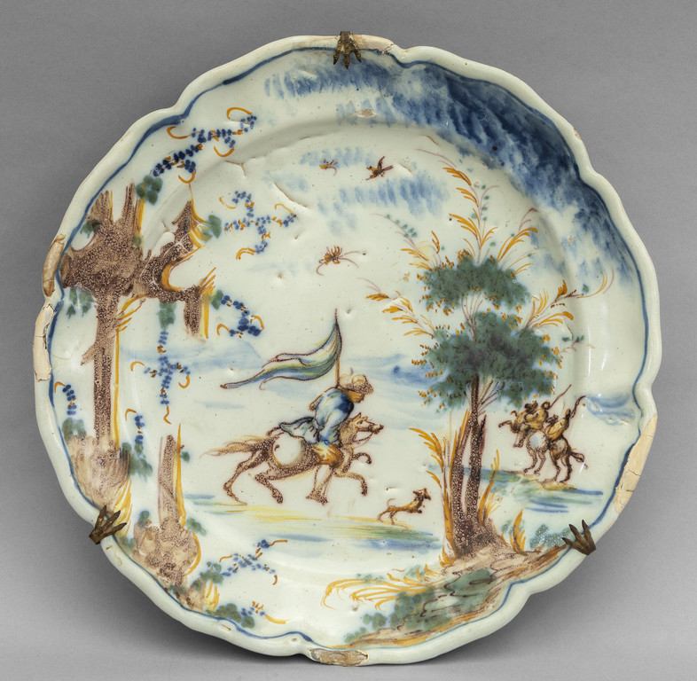 Piatto da parata in vivace policromia con figure di cavalieri e rovine Savona inizi sec.XVIII