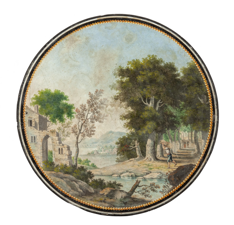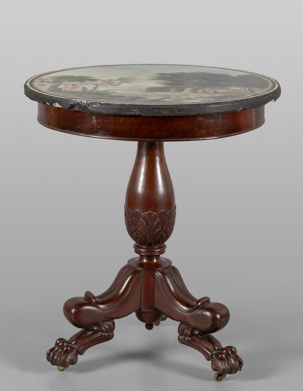Tavolino in mogano con piano in scagliola policroma raffigurante un paesaggio inizi sec.XIX