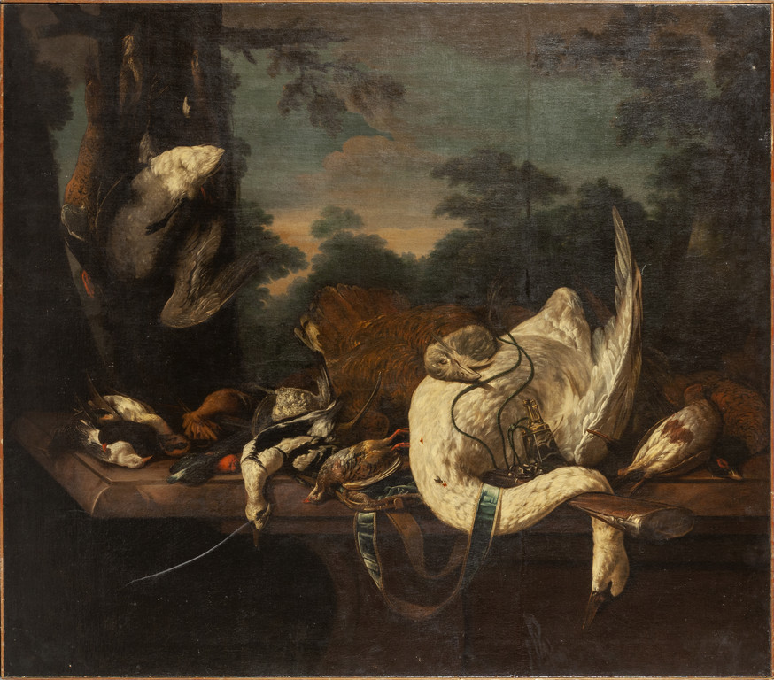Scuola fiamminga sec.XVII 'Cacciagione' olio f.to nel calcio del fucile