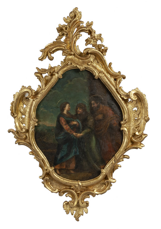 'Scena Biblica' olio su rame di forma polilobata cornice Luigi XV in legno finemente intagliato e dorato