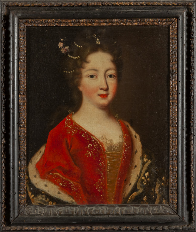 Scuola francese sec.XVIII 'Fanciulla con vestito rosso e perle tra i capelli' olio cornice coeva in legno dorato ed ebanizzato