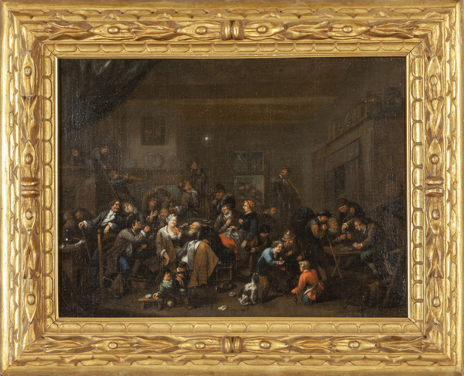 Scuola fiamminga sec.XVIII 'Interno di osteria con molte figure' olio cornice in legno intagliato e dorato
