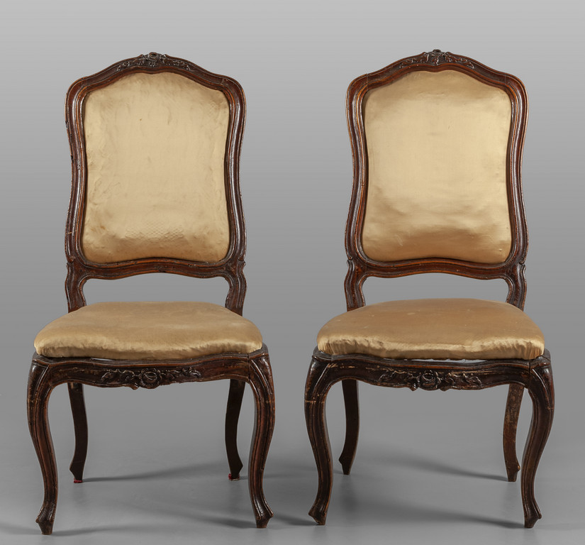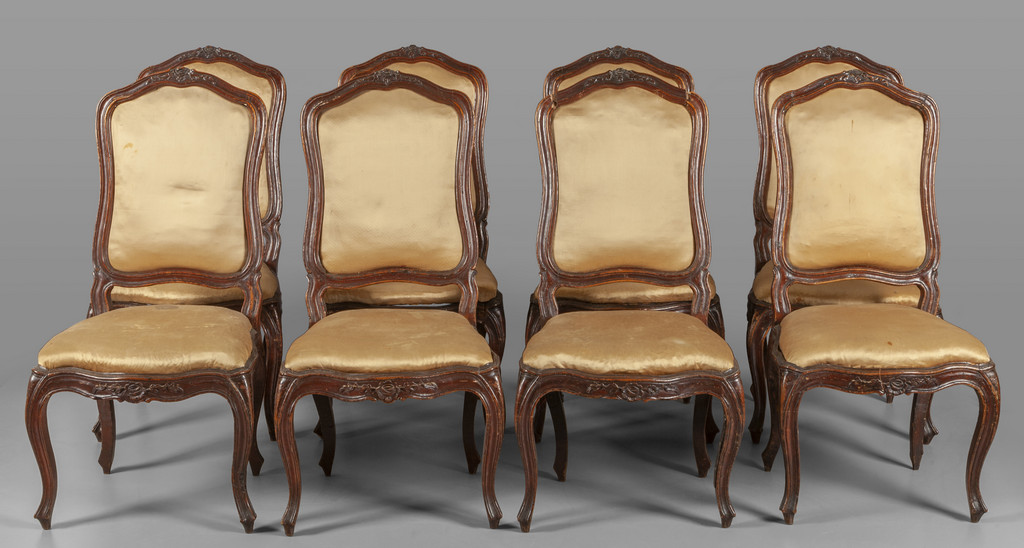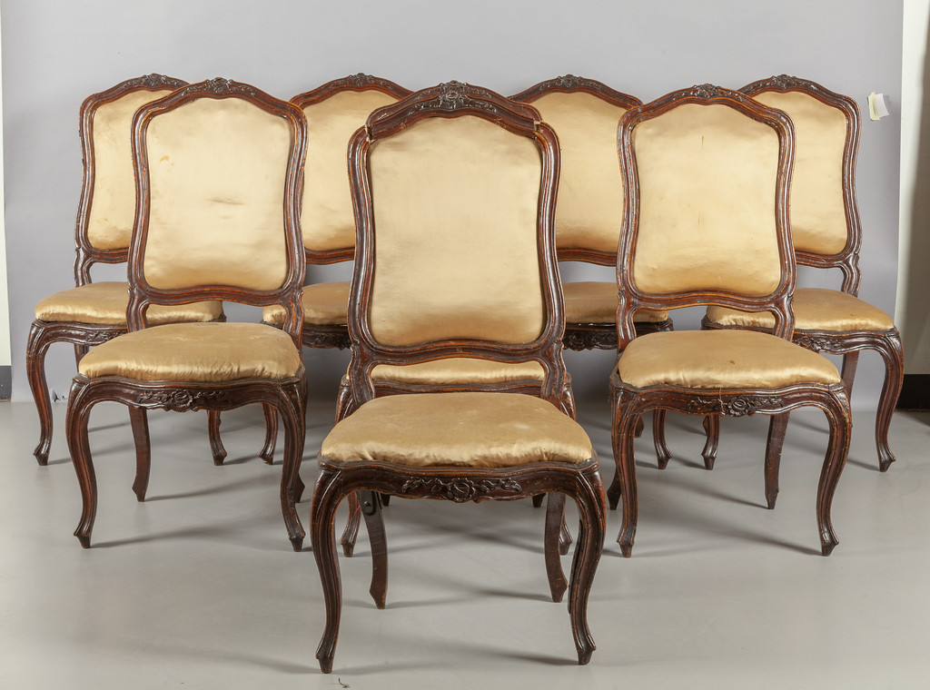 Otto sedie Luigi XV in noce fronte del sedile e cimasa dello schienale intagliato con rosetta Genova I metà sec.XVIII
