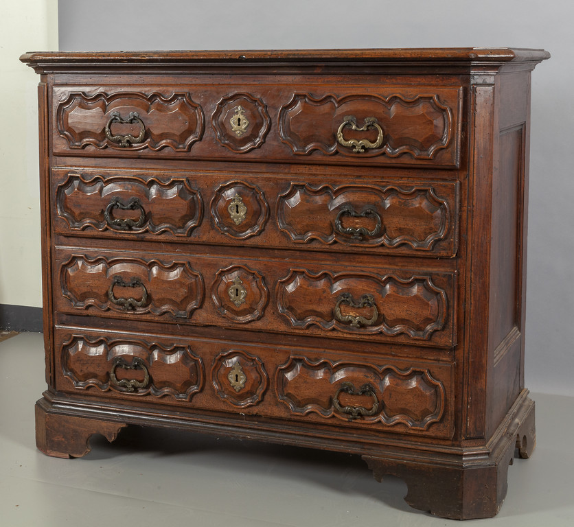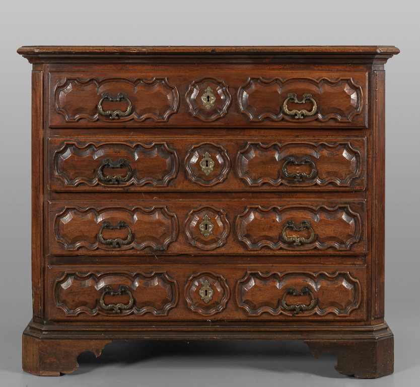 Canterano in noce quattro cassetti sul fronte scolpiti montanti scantonati Piemonte fine sec.XVII