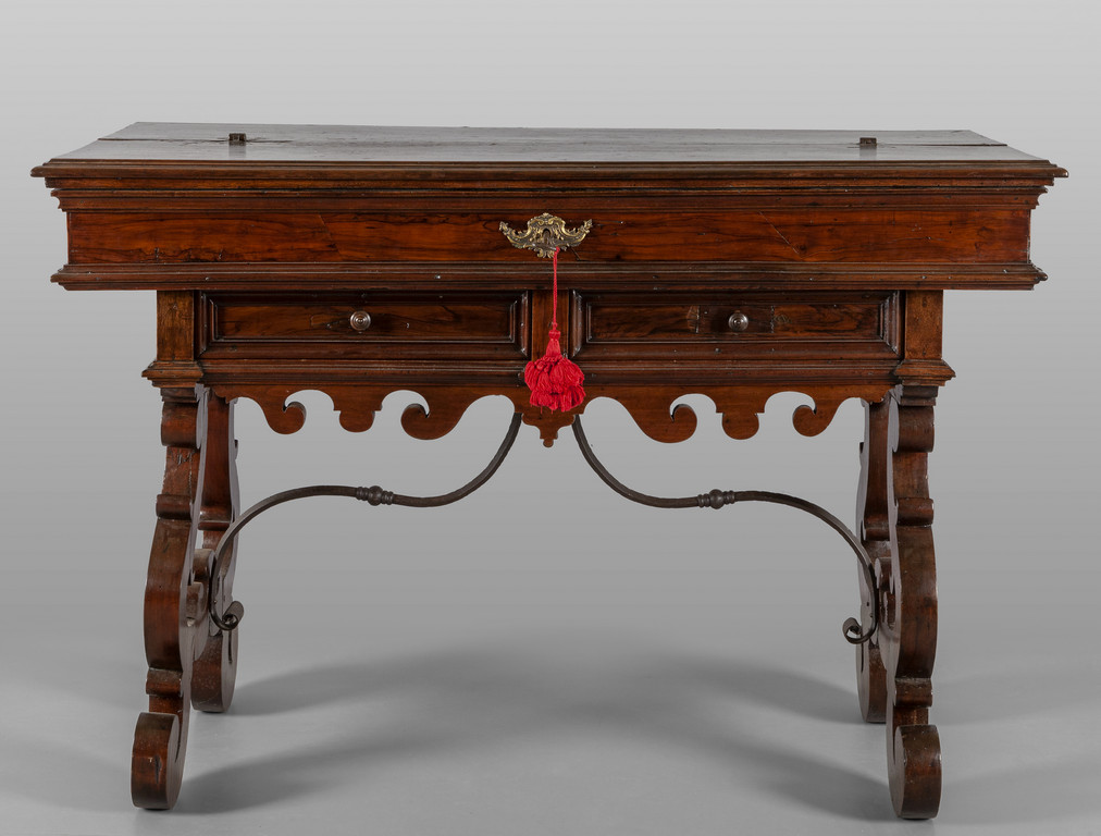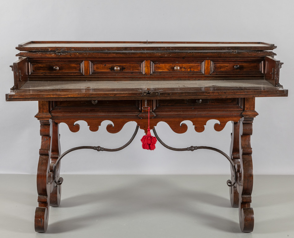 Scrivania Sanfilippo in noce due cassetti nella fascia piano apribile Toscana sec.XVII