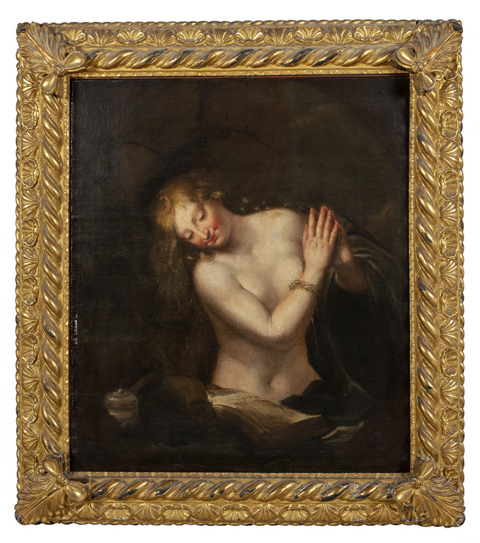 Scuola veneta sec.XVII 'La Maddalena' olio cornice in legno intagliato e dorato
