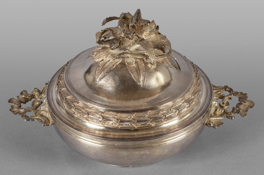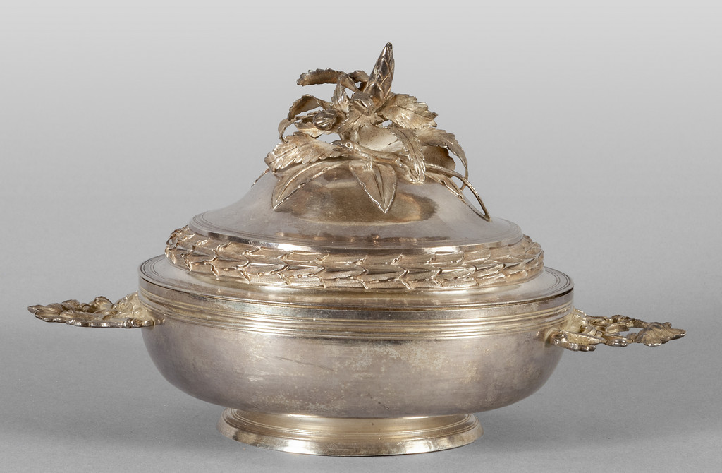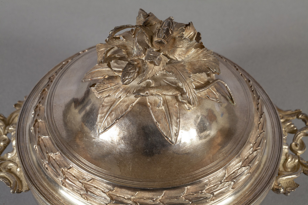 Paiola in argento manici barocchi presa a motivi vegetali con lucertola Genova punzone della Torretta anno 1780