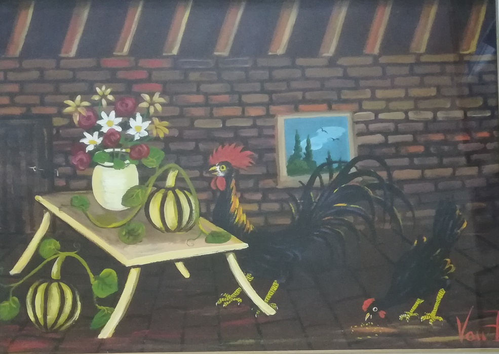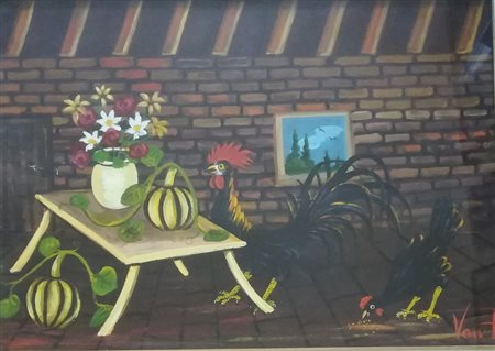 VANDINO DAOLIO (1920-2005) – Interno con galli – Acrilico su masonite cm 70x50 – Opera con cornice